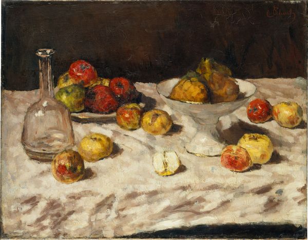 Curator: Welcome. Here we have Philippe Rousseau's "Still Life with Ham," dating to the 1870s. Editor: It strikes me as immediately opulent and…well, slightly unsettling. The ham dominates everything, doesn't it? It is massive and frankly, a bit grotesque in its fleshy realism. Curator: It does command attention. Realism, a popular style in the 19th century, sought to portray life authentically. However, if we situate this work within the context of French society during the 1870s—a period marked by post-war anxieties—one could argue that this seemingly celebratory abundance actually signifies more complex concerns. The ham, arguably, symbolizes the bourgeoisie's relentless pursuit of pleasure and material wealth, against a background of socioeconomic inequality. Editor: I see that tension too. Look at how Rousseau stages everything. The newspaper with bold black lettering folded there near a crumpled piece of paper on a saucer… and the silver chalice all speak to specific cultural touchstones of wealth, formality, the domestic sphere and memory. The leaves placed in the back could easily symbolize something—say renewal?--although given what it frames here, it's hard to say. Curator: Absolutely. Let's also think about class and labor. This meal isn't presented in the throes of being consumed; it has been artfully posed. So it invites critical inquiry: Who would eat it? Who has provided it, and under what conditions? This raises complex issues surrounding food culture, consumption, and representation that art like this inevitably embodies. Editor: And all the glassware: It looks very formal, like someone prepared a meal they meant to show off for. As if this is more a depiction of success and plenty than… sustenance. Look how sharply Rousseau contrasts the clear bottle on the left with the darkly colored glass bottles clustered in the painting’s upper right; how he arranges their placement creates the balance between the foreground and background, a very formal visual staging. Curator: Agreed. In its seemingly straightforward depiction of material goods, Rousseau subtly provokes us to reflect critically about socioeconomic power structures. Editor: Overall, considering the symbols arranged here, and the skill Rousseau uses to bring those symbols into play, it shows you don’t need to be human to speak. “Still Life with Ham” actually communicates a complex historical narrative—beyond merely depicting things. Curator: Indeed, by attending to both its art-historical context and contemporary critical theory, one can see this still life operates not just as an object to behold, but to interrogate, a key visual expression of a particular time, and of its anxieties.