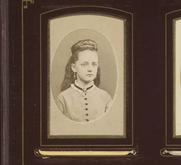 Curator: Up next is a lovely "Portret van een Meisje," or "Portrait of a Girl," likely taken sometime between 1860 and 1900. The medium is photography, and the image aligns with both portraiture and pictorialism styles. What are your initial thoughts? Editor: Immediately, I'm struck by the muted tones, almost sepia-like, that evoke a sense of faded memory. And the formal composition, so carefully balanced… Curator: Absolutely. The girl's gaze, slightly averted, combined with that delicate neck bow, gives off an air of introspective innocence. It reminds us of that pivotal time when a girl teeters between childhood and womanhood. Editor: And the lighting is fascinating! How it softens the contours of her face, blurring the line between subject and backdrop, almost creating a halo effect. The photographer uses this ethereal glow to, perhaps, romanticize youth. Curator: The use of soft focus—very typical of the Pictorialist movement, in which photography tried to imitate painting—adds a layer of emotional distance and even, dare I say, romantic longing. It makes you wonder what her future holds. Editor: Yet, I sense a restraint in her expression. She appears thoughtful but guarded. The composition directs our attention to the symmetrical balance, but her subjective emotional space hints otherwise. There is so much more at play in this portrait beyond the immediate. Curator: Agreed, the framing really amplifies her enclosed status. The visible material context, those rigid gilded edges, reminds me that this image freezes her in time but allows viewers of every age to recognize similar emotional challenges. Editor: Ultimately, the artist makes her enduring image iconic by synthesizing emotion with form. These elements invite close attention and make viewing, decades later, more relevant. Curator: Thank you. These moments captured through portraits can often say the most. Editor: They certainly echo, through their compositional decisions and details, cultural shifts. A testament to photographic capabilities in rendering memory!