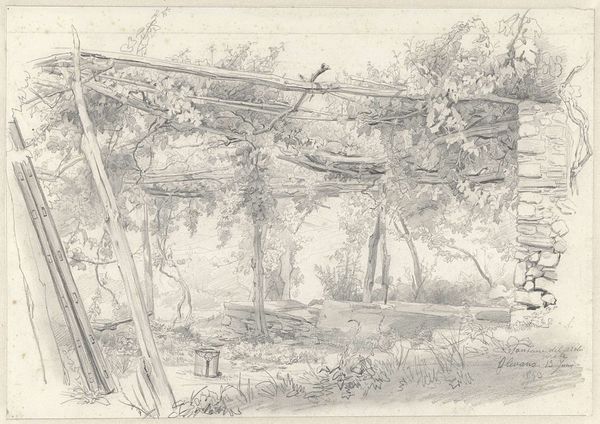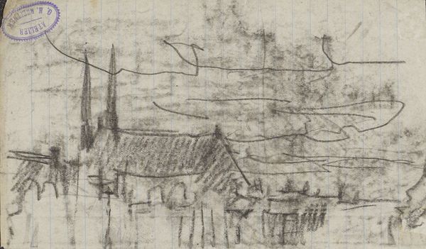 Editor: This is "Landscape Sketch" by William Henry Hunt. I’m struck by the texture he's created with what looks like charcoal. What do you see in this piece? Curator: Notice how the composition relies on contrasts—the solid, angular forms of the buildings against the organic, almost chaotic, mass of the tree. How does the artist balance these shapes? Editor: It feels like the texture unites them. The marks are consistent throughout. So, would you say the sketch is more about the materials than the place? Curator: The materiality certainly contributes to its success. The texture and values create a sense of depth, despite the limited palette. I find it rather effective, don’t you? Editor: I do. I see how focusing on the elements and composition makes the scene much more tangible. Thanks! Curator: Indeed. A keen observation of its structural components provides deeper insights.