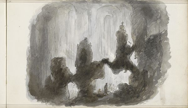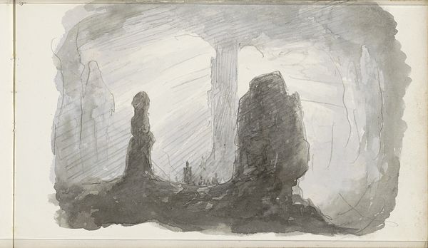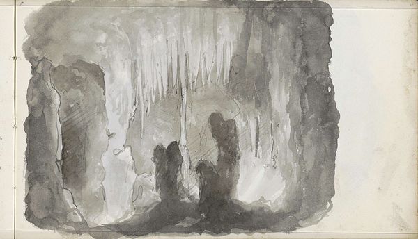 Petrus Johannes Schotel made this drawing, "Druipsteengrot," using pen in gray ink and brush in gray wash. Note the swift, assured way in which the artist has worked. The ink lines are quick and decisive, delineating the cave's rough, textured surfaces and the mysterious figure within. The washes of gray ink add depth and atmosphere, evoking the damp, echoing space of the grotto. Drawings like this were relatively easy to produce, and were bought and sold in quantity during the 19th century. Schotel was not only invested in Romanticism, but also in a developing commercial market for art. The ease and efficiency of the medium allowed for a degree of spontaneity, while also meeting the demands of the art market. It's fascinating how Schotel uses the inherent qualities of ink and paper to capture the unique environment of the cave. This work reminds us that even a simple drawing can reveal complex relationships between material, process, and the broader social context of art production.