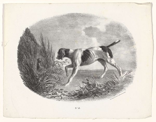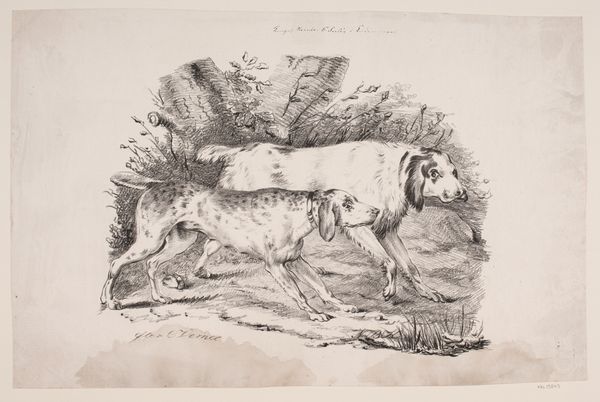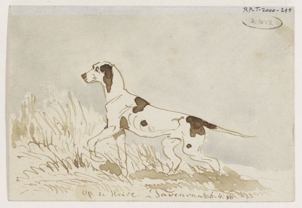 This drawing of a hunting dog was made by Johannes Tavenraat using pen in brown ink and brush in grey ink. The controlled strokes of pen and brush define the scene and capture the alert stance of the animal. Tavenraat's mastery of line and shading lends a three-dimensionality to the composition, particularly evident in the dog’s muscular form and the surrounding foliage. Brown ink creates subtle gradations, suggesting textures and volumes with minimal means. This approach highlights the artist's skill in harnessing the inherent qualities of his materials. The smooth surface of the paper contrasts with the rough texture that is implied in the dog’s fur. The choice of pen and ink, along with the subject matter, situates this work within a tradition of naturalistic studies. By focusing on the artistry inherent in the drawing process, we recognize the value and significance of craft within the broader history of art.