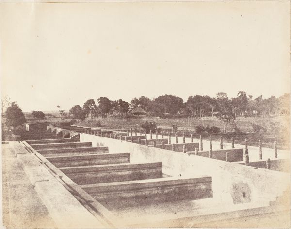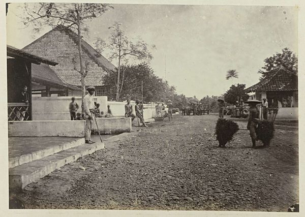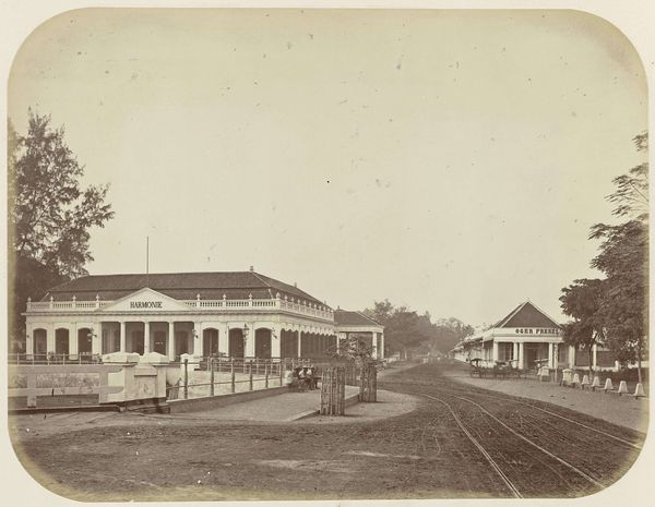This photograph, "Hotel des Indes aan de Molenvliet in Batavia," was created by Woodbury & Page. The composition is structured by strong perspectival lines, drawing the eye from the foreground into the depths of the image. The road and canal converge towards a vanishing point, flanked by the distinct forms of colonial architecture on one side, and lush foliage on the other. The sepia tones create a somewhat melancholic atmosphere, emphasizing the textures of the built and natural environment. The photograph presents a semiotic interplay between the constructed and the organic, suggesting a dialogue between colonial ambition and the local landscape. The linear precision of the buildings contrasts with the unruly growth of the trees. In this sense, the photograph destabilizes the conventional notions of colonial dominance by implying a negotiation between different spheres of influence. The formal arrangement encourages us to question the fixed meanings associated with colonial representation.