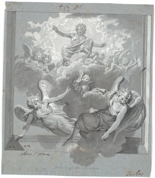 Curator: The apotheosis of a Pope and martyr by Giovanni Domenico Tiepolo, circa 1780-1785. I notice how bright and open the watercolor medium feels in depicting this ascending figure surrounded by angels. Editor: The upward surge really hits you, doesn’t it? All those figures caught mid-motion against that airy, cloud-filled backdrop, very rococo. It gives an immediate impression of lightness, joy and...perhaps the rather idealized nature of ascension narratives? Curator: Absolutely, and to unpack that narrative, the glorification, let's consider the moment. Apotheosis. Not just death, but elevation to divine status. Tiepolo, working in a time of massive upheaval in political power, invites us to question, who *deserves* this ultimate form of institutional sanctification, and what's erased in the process of creating such figures? Editor: A keen point. Tiepolo the Younger, in this piece, stands within the powerful shadow cast by his father, the great Giovanni Battista Tiepolo, both deeply entwined with aristocratic and ecclesiastical patronage. Knowing the family business provides insight into the artwork itself; into the role art played in constructing power and belief at that moment. How did these artworks function in their original settings, who commissioned them, and what messages were they meant to convey to the public? Curator: It's crucial to examine the iconography, not just as religious symbol but as an assertion of cultural and religious authority. The representation of whiteness, maleness, holiness as a convergence of supreme authority leaves room for examining contemporary intersections of social power, in what historical and symbolic context the Catholic church operates. Editor: Exactly! The selection, the narrative, the visual language - all are tools that legitimized specific figures and belief systems at the expense of others. This helps us think critically about the very notion of apotheosis as a politically charged concept. Tiepolo inherited and evolved the family workshop's stylistic approaches to those specific political statements that continued to resonate with audiences invested in its legacy. Curator: So, we circle back to form, knowing that in Tiepolo's moment, the form is political in and of itself. What narratives were explicitly and implicitly allowed into art history? And whose apotheosis remains yet unpainted? Editor: And, how the legacy of artistic lineages like Tiepolo’s shapes not only our historical understanding but also the continuous discourse around art and power in our own era. It all adds more dimensions than those ethereal watercolour washes let on.