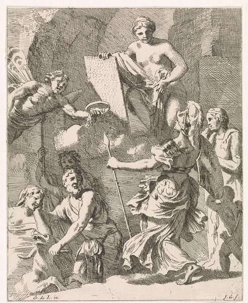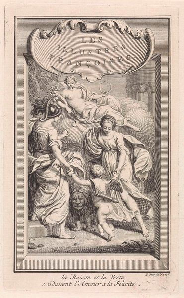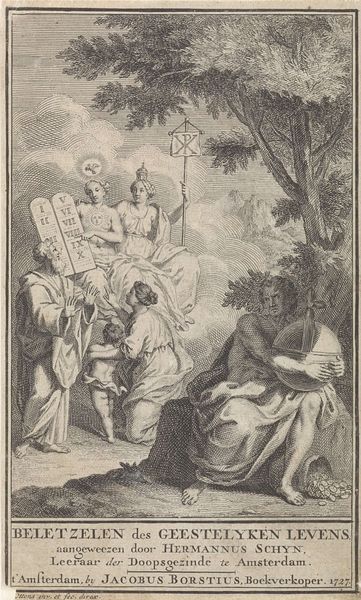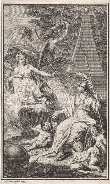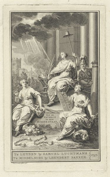Editor: This is an engraving from 1725 entitled "Allegorische titelpagina met personificatie van de Hervormde kerk" (Allegorical Title Page with Personification of the Reformed Church) by Frederik Ottens. The baroque-style composition feels very formal and organized, yet somehow quite surreal with all the figures. What strikes you about this piece? Curator: Observe how Ottens utilizes a strict, hierarchical arrangement. The celestial architecture atop the clouds, bathed in light, firmly establishes a divine realm. Note also the distinct planes; from the foreground figures engaged in instruction to the receding cityscape under an arch. The contrast between light and shadow is carefully managed to enhance this structured arrangement. Editor: The contrasting light and shadow really draws the eye upwards, especially to the architecture. What do you make of the angel pointing upwards? Curator: Indeed. Semiotically, the gesture, along with her direct gaze, serves as a visual anchor, reinforcing the thematic hierarchy. But consider the line. Isn’t it curious how the bodies are rendered in smooth line work while the clouds, in contrast, appear textured, built from many short hatching strokes? It yields a stark contrast. Editor: It does add a kind of drama, this juxtaposition of the figures’ clean outlines and the more heavily worked skies. How would you say this use of line contributes to the overall message? Curator: Precisely. The engraving's success hinges upon this calculated distribution of detail. Notice the restrained but skillful employment of hatching to articulate volume and texture. The intention isn't mimesis; it's about directing the viewer's attention to key symbolic zones. Editor: I see what you mean. Looking closely reveals so many calculated artistic choices. Curator: Indeed. Ottens presents a well-composed visual rhetoric in its structure.