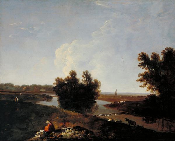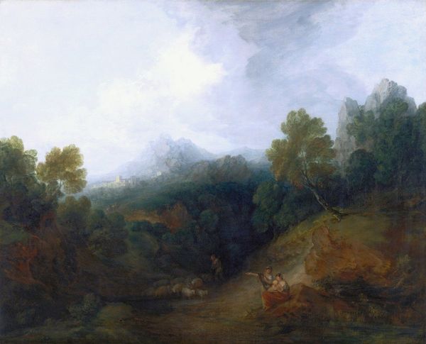 Editor: This is "Landscape, near Bath" by Thomas Barker of Bath. It's quite a grand landscape. It feels very romantic in its scale, almost… longing. What do you see in this piece? Curator: I see the picturesque ideal, heavily influenced by the social hierarchies embedded within the landed gentry and their estates. Notice how the composition invites the viewer to survey the land, mimicking the act of possession and control. Editor: So, the beauty is intertwined with power? Curator: Precisely. Consider also the shepherd, a romanticized figure, but also a symbol of labor, carefully placed within this power dynamic. What does that suggest to you about Barker's intentions? Editor: I guess I hadn't considered the social commentary within the landscape itself. It's more complex than I initially thought. Curator: Indeed. Art often reflects and reinforces the power structures of its time.