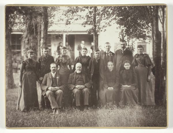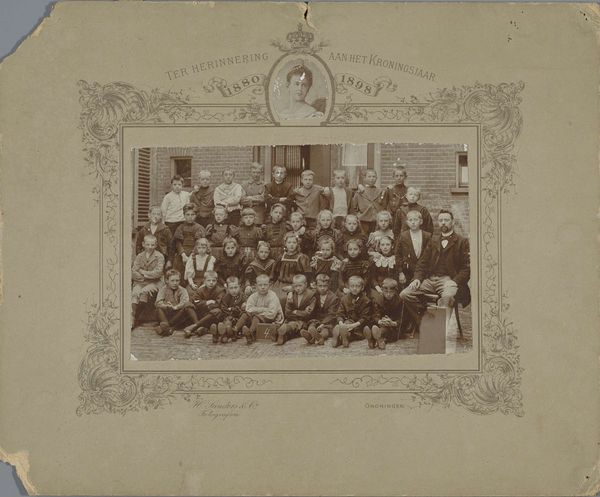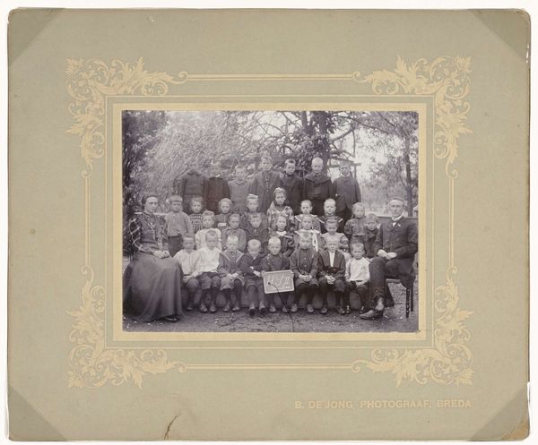 Curator: Looking at this group portrait, I immediately sense a strong visual weight in its meticulous arrangement. The expressions of these children seem held, expectant, a world away from the open-air spontaneity we expect today. Editor: This photograph, titled "Groepsportret (klassefoto) van klas H S III in Ter Aar" and created sometime between 1900 and 1920, presents us with much more than just a simple class photo. It gives us insight into education, class structure, and childhood during this era. The photographer was Bernard de Jong. Curator: I notice immediately the rigid structure, mirroring the formal social roles impressed on children so early. The darkness of the clothing, the uniformity, speaks of suppressed individuality. Is it the social or technical limitations creating that serious demeanor? Editor: Both, likely. Clothing was very regulated for gender, class, age, even religion, during that time. But also, posing for a photo was much more involved then, calling for longer exposure times which affected body language. To add to this, the visual weight, almost like an archetype, shows how much authority the educators embodied as parental and knowledge figures. It evokes feelings of stability, a controlled environment where children and learning were curated, in and of itself. Curator: Thinking about this image within the period’s restrictive gender roles is quite interesting. There seems to be only a few visible women in positions of authority and power. We see here in the contrast of garb and size who is being groomed to step into certain roles based on social strata. Who had options. Editor: Right. In these early photographs, we witness not only the evolution of a technology but also a snapshot of how society itself was being developed, and that memory carries so much significance. It's an enduring reminder of that historical period. Curator: Indeed, a sobering testament to what has changed—and what perhaps hasn't. Editor: For certain! Thank you, truly.