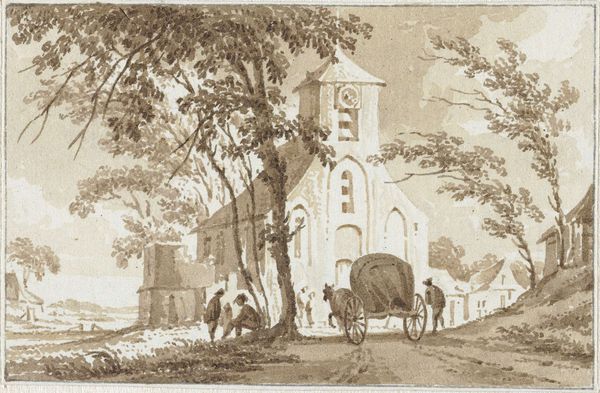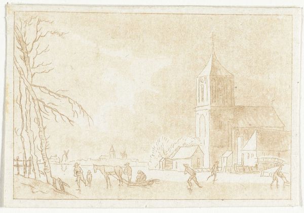 Editor: This is "Wintergezicht," a work by Anthonie van den Bos, created sometime between 1778 and 1838. It looks like a brown ink drawing, maybe a preliminary sketch. I’m struck by the contrast between the static architecture and the active figures on the ice. What can you tell me about this piece? Curator: This is a compelling snapshot of everyday life. Let's think about the materials first: brown ink, likely iron gall ink, easily produced and readily available at the time. This points to a function, perhaps. Not a grand commission for display, but maybe a study, or even something produced for the market, catering to a burgeoning middle class. What does the scene depict to you in terms of social activities? Editor: Well, you have people skating, someone pulling a sled with what looks like passengers, another sweeping the ice... It's all very…ordinary, really. Curator: Precisely! And the "ordinary" is key. This isn't a heroic landscape. It highlights the activities of working people in their environment. Consider the labor involved: gathering wood, traveling by sled—ice becomes a form of infrastructure here, a resource facilitating daily routines. Also, notice the Church tower dominating the drawing: It seems at odds with the ‘commonness’ of the everyday lives on the ice. Does the church tower’s relevance strike you at all, as something looming over it all? Editor: I see what you mean. It represents a structure, almost an imposition, over the fluidity of daily life. What strikes me now is that contrast—how the sketch captures labor and life within the shadow of this social structure! Curator: Exactly. And, the artist’s *labor* too! The time to create, the intention behind the production of something that now enables *us* to have this conversation. Material, production, consumption, society – they're all entwined here. Editor: This has been enlightening. Looking at it through a material lens really shifts the focus to the work and labor that constitute the art *and* its subjects!