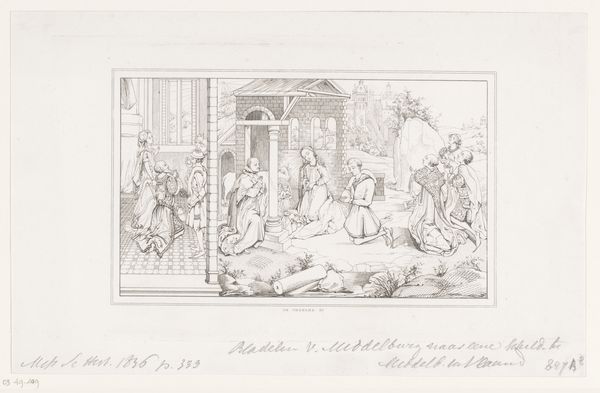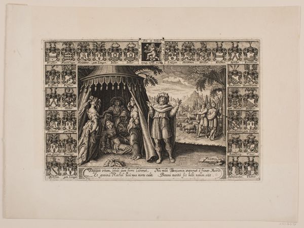 Curator: At first glance, the flurry of line work makes it resemble an intricate lace pattern, although lace fashioned from some gravely serious narrative, I would guess. Editor: Precisely! What we are beholding is a print crafted around 1817 entitled, *Abenteure von den Niebelungen*. The print finds its home here at the Minneapolis Institute of Art. Curator: *Niebelungen*, adventures… So, this depicts episodes from that old German saga? Editor: That is exactly correct! The composition adopts a layered, almost architectural format of nested scenes rendered in very fine, spare lines—typical of line engraving of this era. Notice the distinct compartments, a visual strategy which creates multiple vanishing points. Each little world teems with figures in dramatic poses. Curator: Dramatic indeed! Those archways containing each little tableau are quite theatrical in a very deliberate, romantic way, wouldn't you say? I wonder, what stories could each scene tell? It reminds me of a set of shadow boxes capturing distinct moments of one singular, grand narrative. A great romance, perhaps? Editor: In addition to historical and thematic components, the artist makes compelling use of the stylistic language of romanticism as it was understood in Northern Europe at that time, emphasizing linear clarity over painterly gestures. It allows the viewer to appreciate form, even from a distance. Curator: It’s almost as if they are inviting you to come closer, whispering little secrets within this universe! I must admit, it really makes you think of this timeless tale with new fascination... all those chivalrous knights, dragons, hidden treasures. This unassuming line drawing manages to pack so much emotional wallop! Editor: Indeed! By dividing its story across separate pictorial planes the engraving reveals the value of storytelling that is simultaneously fragmented, while also unified in form. It reveals art history to be a complex dialogue. Curator: It feels that some echoes and whispers remain locked inside the surface—waiting to be found. Editor: And thus the artwork maintains its allure through centuries, inviting each viewer to form their unique relationship with form, time, and myth.