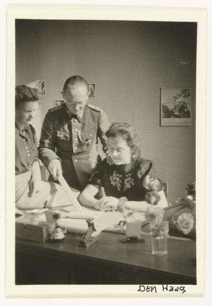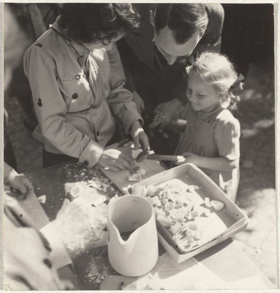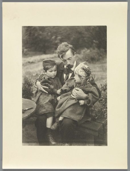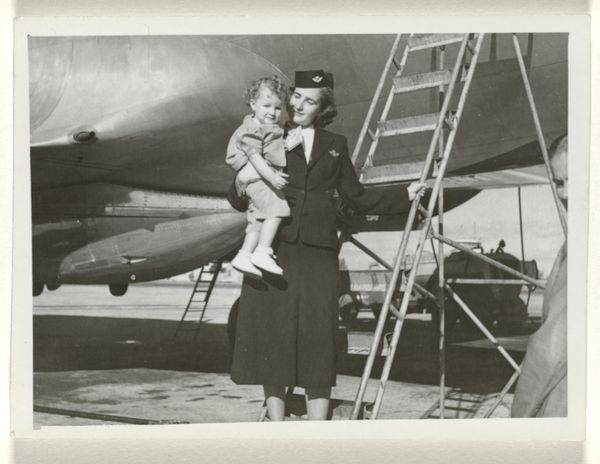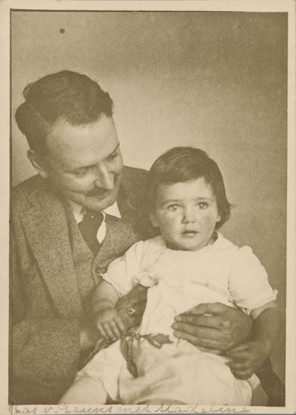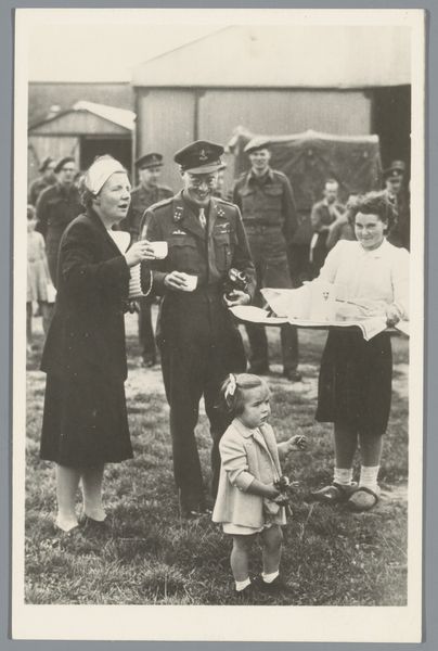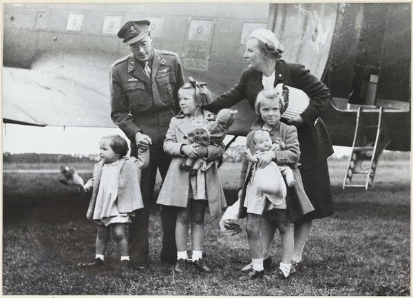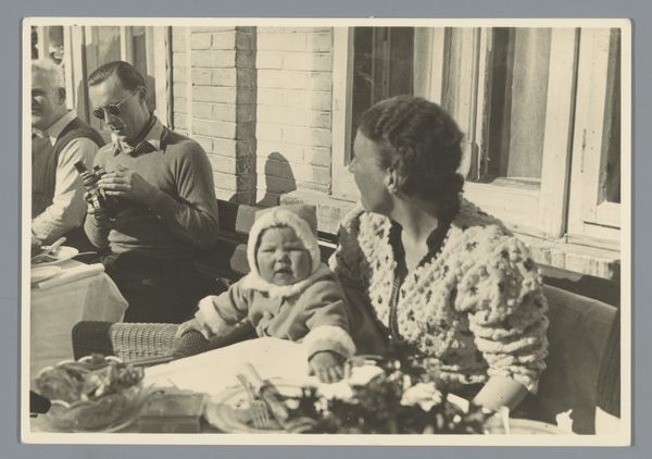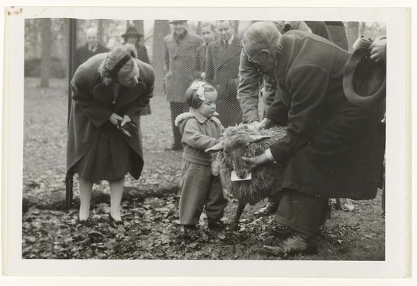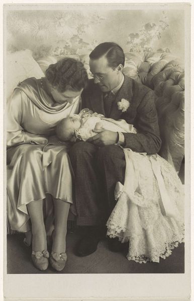 Curator: Here we have a gelatin-silver print titled "Prinses Margriet weer thuis," attributed to Atelier de Jong and created sometime between 1945 and 1948. Editor: The first thing that strikes me is the tenderness in this image. It feels very intimate. The tones in the monochrome palette lend the whole piece a feeling of old-world grace. Curator: Indeed. It’s important to remember the historical context here. Princess Margriet was born in Canada during the Second World War while the Dutch royal family was in exile. The symbolic weight of her birth in liberating allied territory—in Ottawa, which was temporarily declared Dutch territory to ensure she'd have Dutch citizenship—is immense. Editor: The child is certainly the visual and emotional focus. I note how she looks at the object, the lens of the camera it seems, with great curiosity, with the older man crouched at her level also engaging directly. It is about a circle of protection around the royal heir. Curator: Precisely. Images like this cemented the restored monarchy's connection with its people following a traumatic occupation. They were carefully crafted visual tools. It is no accident that the photographer focused so heavily on portraying innocence, normalcy, and most of all, homecoming. The return and integration of the Dutch monarchy after years of war, occupation and displacement of its most visible symbols would have been hugely influential for those who saw it in media releases. Editor: This image certainly captures the public's sentiment during that period. One wonders how they viewed these carefully crafted representations after they settled back into relative peacetime after so much struggle. Curator: The symbolism of the moment carries forward even today, it shows the power of constructed images. This photography functions as an active document, revealing cultural memories and values, making a case for its role within history. Editor: Absolutely, and as a lasting historical artefact it prompts vital questions regarding photography’s societal and symbolic role through time. The photograph presents so many opportunities for exploring the impact on postwar life, memories, or national image creation, doesn't it?