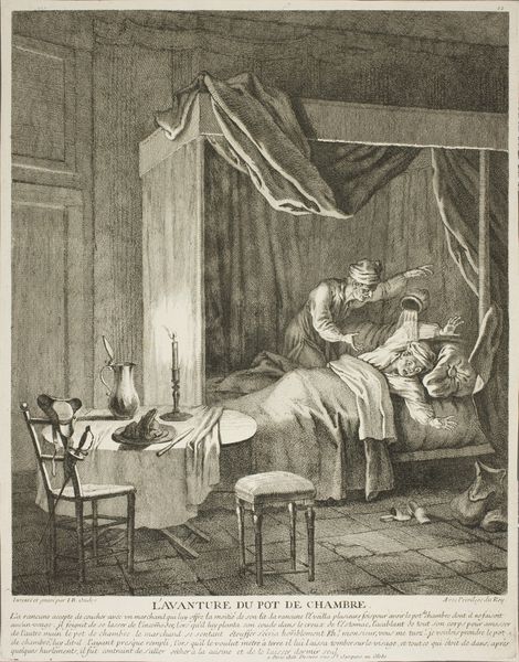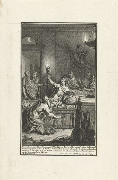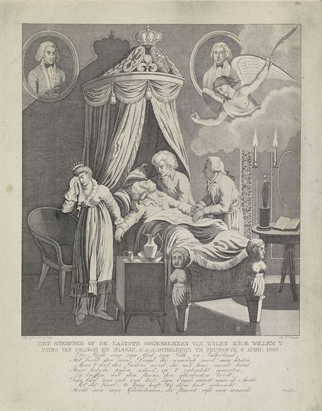 Editor: This is a print titled "Sterfbed van prins Willem V, 1806," made in 1806 by Jacobus Wijsman. It's an engraving, so lots of sharp lines depicting the Prince on his deathbed. The mood feels heavy and theatrical, almost staged. What do you see in this piece? Curator: Beyond the literal scene, I see a confluence of symbols carefully chosen to evoke particular emotions and legitimize power. Notice the crown suspended above the bed, juxtaposed with the angel ascending with Willem V’s spirit? It creates a potent visual narrative of earthly authority yielding to divine judgment and acceptance. Editor: Yes, I noticed that angel. And the crown feels so heavy above the bed, doesn’t it? Curator: Precisely. The symbols tell a story about duty, sacrifice, and the presumed divine right of kings, even in death. Consider the portraits on the wall; they are likely his ancestors. This image anchors Willem V within a historical and familial lineage, reinforcing the idea of inherited leadership and legacy. Who do you imagine this print was meant to serve? Editor: Perhaps as propaganda? To ensure his legacy despite the changing political landscape of the time? Curator: Indeed. Remember that prints were a popular medium for disseminating information and shaping public opinion. This image could very well serve as a tool to solidify Willem V's image among his supporters, even after his death. What lasting feeling does the piece leave you with? Editor: The theatrical composition still feels…odd to me, as if manipulating reality to manufacture a narrative, even after death. I found the symbolic links insightful. Curator: That critical assessment is important. Visuals are tools that express specific aims through enduring symbols, so it is helpful to always question what a symbol meant, means now, and will mean later.