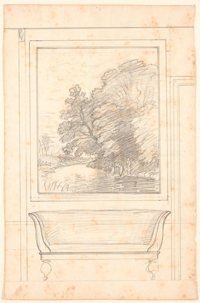 Curator: Soothing, like a breath of fresh air in a dusty gallery! This artwork presents a bucolic scene, framed by a design intended for a wall hanging. It’s titled "Behangselvak met omlijsting en lambrisering, uit een ontwerp voor een zijwand", created around 1791 by Jurriaan Andriessen. Editor: It's an escape, isn't it? That muted palette...the soft greens and pale blues... It feels more like a daydream than decoration. Is it watercolor? Curator: Yes, and also drawing combined with some etching. Andriessen was known for these decorative pieces; imagine this not just as art, but as part of an interior design statement, a little window to a classical ideal within a Neoclassical home. Wallpaper as high art. Editor: I suppose it puts "feature wall" in perspective! Who are those tiny figures scattered across the landscape? Are they enjoying a picnic, staging a play? It looks like a little secret society. Curator: That’s the joy of it, isn’t it? These weren't merely pastoral scenes, they were aspirational, hinting at enlightened leisure and classical virtues in a society undergoing massive social upheaval. The elites wanted to project this kind of sensibility. Look at the architecture in the background, referencing a noble and ancient past. Editor: Very mannered. It feels... staged. Even the "natural" elements feel carefully placed, each tree, each figure just so. Do you think people really saw it as this grand vision, or did it mostly serve as posh background noise? Curator: Undoubtedly a bit of both. These scenes provided a visual vocabulary of status and taste, but Andriessen's skill also invited viewers to dream beyond the domestic sphere. By turning their houses into classical landscapes, patrons weren't just making a decorative statement; they were attempting to claim a kind of cultural capital. Editor: The political dimension makes the light feel harsher now...but perhaps that tension adds to its strange appeal. This landscape hints at a dream—the good life or some kind of upper class myth building. Curator: Precisely, and that enduring tension continues to give the artwork its voice, doesn't it? It’s lovely to ponder Andriessen’s intent, so far removed from the ways that such decor is conceived and employed in our own era. Editor: Absolutely. It makes you question what silent messaging hides within the decorations of today!