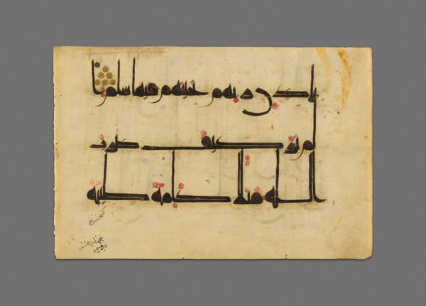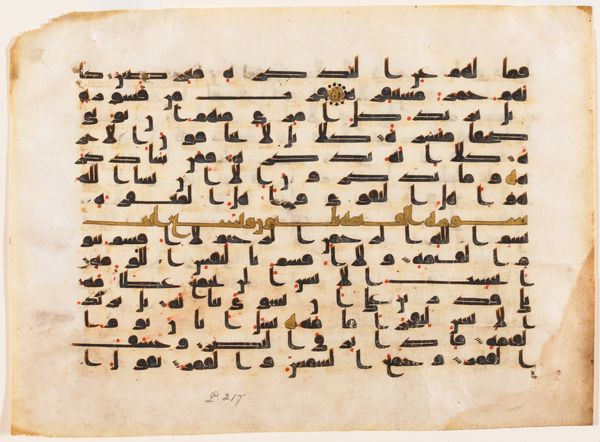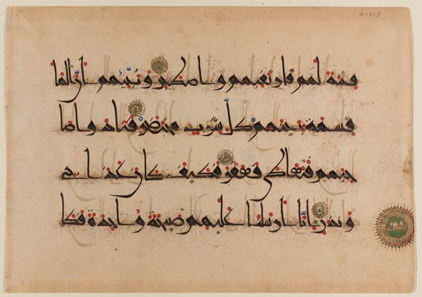 Editor: Here we have a page from a Qur'an manuscript, created around the 11th or 12th century. It’s made with ink on paper. The elegant calligraphy gives it a peaceful yet commanding presence. How do you interpret this work from a formal perspective? Curator: What strikes me immediately is the deliberate arrangement of the script. Observe how the horizontal lines dominate, creating a sense of stability. These are punctuated by the vertical strokes that add a rhythmic element. The spacing between the lines and words isn't just functional; it's a crucial element in the overall visual composition, creating a balanced positive and negative space. Editor: The red and blue dots and small flourishes are also interesting! What is the purpose behind these design choices? Curator: Precisely! Consider the carefully placed diacritics and vowel markings in red and blue. Functionally, they aid in pronunciation. However, visually, they inject dynamism into the otherwise uniform black script. It also prevents monotony on the page and draws your eyes across it. The circular gold and ornate ornament serve as markers, yet also function as visual anchors that contain and balance the piece. Editor: I see, so the added colors give an overall sense of flow. Does the specific style of script impact your view? Curator: Absolutely. Though I couldn't tell you specifically which passage this shows, consider the evolution and standardization of Kufic script as crucial to the early spread of the Qur'an, not just religiously but artistically. Notice the bold angularity; the thickness variation communicates stability, and power. Do you notice how those letterforms contrast and play off of each other to make for such a distinctive visual experience? Editor: Yes, it does, very powerful! I never considered the weight of each word’s construction. I am also appreciating the power and grace of such disciplined, geometric forms of script. Curator: Exactly! Understanding the interplay between text and design invites deeper appreciation of this manuscript, enriching our viewing experience by making us aware of all the careful and complex details within it.