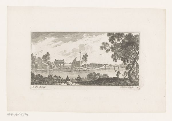 Editor: This etching by Adam Perelle, “River with Houses on Both Sides,” made sometime between 1650 and 1695… It’s fascinating how Perelle creates so much depth with such delicate lines. What do you see in this piece that might go deeper than just a simple landscape? Curator: Indeed. The initial image seems straightforward, but let's consider the symbolic language. The river itself. How often is water used as a metaphor? Editor: Baptism comes to mind, a fresh start or purification. Curator: Precisely. Now, consider the placement of the church, a prominent structure dominating one side. Notice anything particular about the placement and proportion in the wider scene? Editor: Well, the church is positioned directly opposite a collection of people sitting by the river. Perhaps contrasting earthly concerns with spiritual ones? Or, maybe highlighting that both occupy a central place within society. Curator: Excellent observation! Look at the barren tree next to people which contrasts sharply with other abundant vegetation around the riverbank? Are these people perhaps outside some sense of social belonging? These symbolic relationships build a visual narrative of community, faith, and perhaps even a hint of social commentary. Don't you find it interesting that the "straightforward landscape" leads us into multiple questions about faith and belonging? Editor: That's so true. I would've looked over so many symbolic meanings by merely looking at the whole artwork. Curator: Every mark holds potential. Now we are empowered to discover. Editor: Exactly, there's so much more depth once you start to decode those signs. Thanks, I'll definitely approach artworks differently from now on!