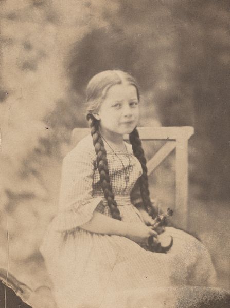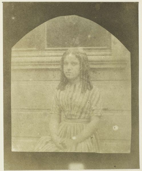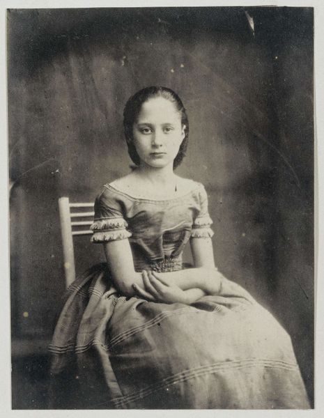 Curator: Marie LaPorte, a gelatin silver print created around the mid-1850s. Looking at the subject, what strikes you initially? Editor: An immediate sense of faded innocence, almost ghost-like. The tonal range creates this overwhelming wistful feeling, like a memory barely held. It's soft, yet somehow a bit unsettling. Curator: Yes, and the softness certainly results from the medium. Think of the challenges inherent in photography from this period, particularly the constraints around capturing movement or gesture. We might say the photograph achieves a sense of tranquility precisely because of its technical limits. Note how the composition, quite centered and balanced, mirrors this stasis. Editor: But that stasis doesn’t sit easily with me. Considering the limited agency afforded to young women in that period, the composed posture, the neat braids—I wonder about the performative aspect. This isn't just a photograph, it's a construction reflecting societal expectations placed upon young girls, a rigid, almost doll-like image they were expected to embody. Curator: An astute observation. Looking at the lines—the verticality of her form countered by the horizontality of her braids—one also finds echoes of Neoclassical portraiture of the time. Restrained, balanced, evoking idealized virtue. The materiality here, gelatin silver, enhances the grayscale, eliminating any distractions. The image becomes purely about form and light. Editor: But can we truly extract it from its sociopolitical moment? Early photography was largely a tool for documenting social types, power dynamics were so deeply ingrained. I look at her clothes, that somewhat simple checkered dress, and consider what socioeconomic stories are woven in too, what it communicates or perhaps, conceals, about Marie's place within the 19th-century social hierarchy. Curator: Context is useful, I agree. However, I still find great importance in simply deconstructing what's before us: the formal harmony of the image, the artist's adept handling of chiaroscuro despite primitive equipment. It transcends being solely a record, becoming a commentary on visual aesthetics themselves. Editor: Perhaps. For me, the beauty lies precisely in its capacity to simultaneously reveal and conceal the layered realities of Marie's life, its historical echoes. To reduce this potent image simply to lines or light, I think, would rob it of its historical weight. Curator: Fair enough, though the beauty, to my eye, inheres precisely in those formal choices and aesthetic properties which elevates the work from documentation to art. Editor: I guess, ultimately, the tension between documentation and aesthetics creates an enduring dialogue. The artwork compels us both, if from slightly different angles.