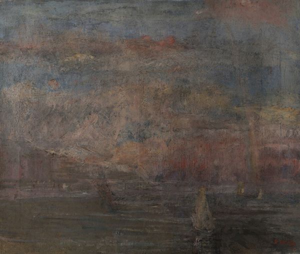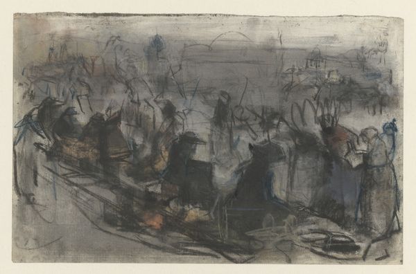Editor: This is James Ensor's "The Strike" from 1888, created using watercolor. The piece is brimming with figures and flags. The layering of colors gives me the impression of a crowd scene almost vibrating with energy. What stands out to you? Curator: The chromatic scale employed offers a complex interplay between foreground and background. Consider the visual weight accorded to the cluster of figures massed toward the lower register; does the subdued palette invite or resist a reading that emphasizes their material conditions? Editor: Resist, maybe? Because it sort of blurs the lines, so I don't know where the people start and stop, which distracts me. Is that kind of abstraction common in watercolor pieces from that period? Curator: One must appreciate how Ensor marshals pictorial space in dynamic tension. The figures themselves constitute only one set of compositional elements. Consider the linear arrangements imposed by the flags, architectural elements, and the horizon itself. Are you attuned to any potential tension—or harmony—between the geometry of line and the dispersal of colour? Editor: I see the contrast now – it's a planned chaotic style! The flags create this linear feel which gives you a different perspective on the soft figures beneath. Thanks, I definitely look at it with a fresh pair of eyes now. Curator: Indeed. Apprehending the formal tensions embedded in Ensor’s craft practice unlocks deeper meaning. This careful analysis enhances our reading. Editor: I agree! It’s shown me the relationship between lines, geometry and artistic decisions within "The Strike."