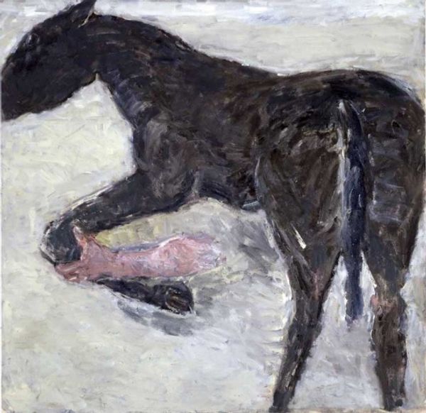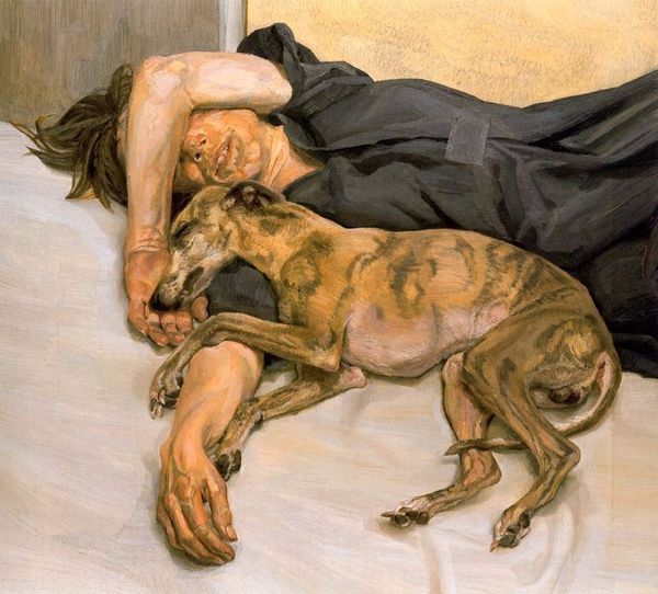 Editor: Here we have Lucian Freud's "Eli" from 2002, an oil painting rendering of a dog— but not just *any* dog. I can’t help but think about how vulnerably this beautiful creature is splayed across the canvas… such intense realism! I'm really struck by the raw emotion Freud manages to convey with those impasto brushstrokes. What strikes you most about this piece? Curator: That’s perceptive, the vulnerability. Freud had this unflinching, almost brutal honesty, didn't he? He wasn't about idealizing. The pose seems completely un-self-conscious. Do you find yourself wondering about the relationship between Freud, that very particular fleshy palette and *everything else*? The colour relationships of the human form here next to his hound is *so* telling.. it is such intimacy and care and, if you don’t mind me adding, so *honest.* Editor: I see what you mean...like he's stripping away pretense to show us something essential. I do love his visceral interpretation; its unlike others. The feet do add a surprising intimacy. Is it known who they belong to? Curator: Ah! Who do they belong to? Here comes the story! As is written in the biography on him - “Breakfast with Lucian” Geordie Greig writes – *There can’t be many owners of pedigree dogs who find themselves having to act as both minder and life-model.* What did Eli’s presence mean? Well only Mr.Freud and Eli know that! One must wonder though - what sort of mood created this! Perhaps one we should be able to create in our own relationships! What do you think? Editor: So interesting! A bond forged in companionship, art, and well, simply *being* together. It's a tender narrative when you view it through that lens, which I didn’t initially. It has given a new fresh perspective for me, certainly. Curator: Exactly! It’s there, isn’t it? I find I have the capacity to admire. Thanks for sharing your view, really.