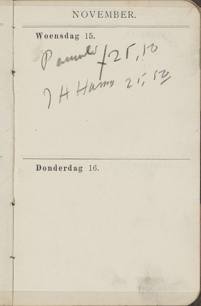 Curator: Before us we have “Annotaties” by George Hendrik Breitner, dating back to 1893. It is currently held in the Rijksmuseum collection. Editor: The composition strikes me immediately. There's an intentional sparseness. The handwriting is also captivating; it makes me think of a fleeting thought captured. Curator: Absolutely. The mixed media work primarily features ink on paper, and the deliberate use of aged paper enriches the effect you point out. It creates a tangible sense of the past being present. Breitner here really exposes the immediacy of handwriting in its original historical context. Editor: Given its likely origin as a personal sketchbook entry, one wonders about the private, possibly unedited nature of this work? This feels like peeking behind the curtain, something especially precious with artists known for a more public persona. I wonder where the annotation fits within Breitner's entire social framework. Curator: Indeed, the historical context shapes the piece, adding depth to our appreciation. Still, the calligraphic lines hold an inherent beauty; the letterforms, the angles of the script, everything works together cohesively, as an artistic statement even aside from the information they hold. Editor: Yes, and this sense of artistic statement reminds me that the medium itself plays an important role. The visible texture of the paper supports the intimacy of the gesture, allowing it to transcend merely historical significance to take on, perhaps, personal expression of some kind. Curator: And if we observe the page carefully, there’s actually an economy of space. Notice how few phrases or words appear; a concentrated sense of meaning seems to have been distilled into just a few marks. The tension created through contrast is so moving to the contemporary viewer, centuries later! Editor: Considering its public display now, its inclusion in a museum shifts the power dynamic – originally, a moment in Breitner’s world available only to him now becomes part of a broader social and cultural conversation. A rather poignant notion to consider! Curator: It seems our approaches to appreciating this piece both meet here at the crossroad of personal experience and objective art. It shows just how many entry points there can be! Editor: Precisely, each encounter is a unique opportunity for connection.