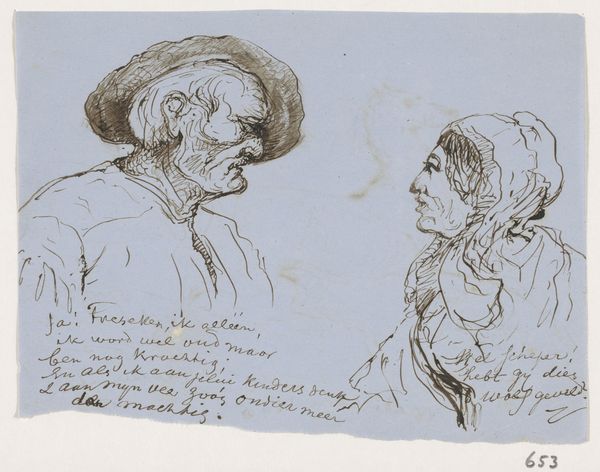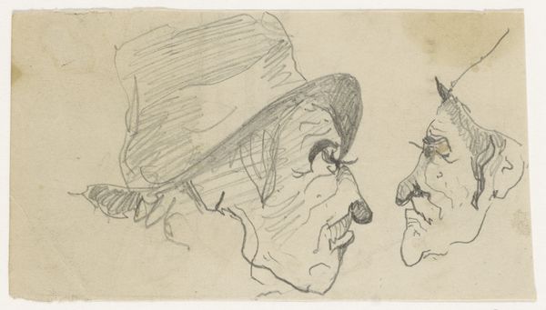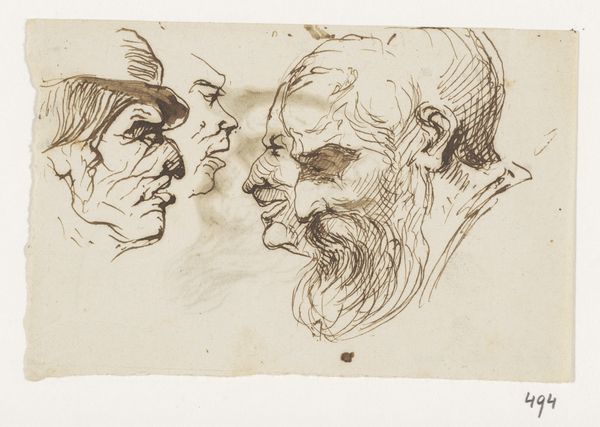Curator: We're standing before Johannes Tavenraat's "Three Caricatural Male Heads," dating from 1819 to 1881. It’s currently held here at the Rijksmuseum. It appears to be executed with pen. Editor: My first thought? Exaggeration! The artist certainly wasn’t shy about amplifying distinctive facial features here. It's got that sketch-book immediacy, like a glimpse into the artist’s imagination. Curator: Indeed. Caricature thrived as a visual shorthand in the 19th century. What makes this significant, in a historical context, is the way such imagery participated in, and sometimes challenged, social and political discourse. Cheap printed versions of such caricatures circulated widely. Editor: The heavy brow ridge in these faces gives me almost neanderthal vibes—the artist is making a statement. It's not just about physical features, but perhaps social commentary of that time. Curator: Precisely. There's a certain social leveling going on here. Consider the time frame; Tavenraat was working in the shadow of the Enlightenment and the French Revolution. Caricature became a potent tool for critiquing power and the established order. We must consider what specific message it may be delivering. What kind of men were people thinking about in these derogatory ways? Editor: I’m also struck by the artist’s line work. Look at the use of line and shading to describe the sunken cheeks, pursed lips and nose details; they become grotesque! It plays on visual archetypes and the idea of types, reinforcing certain cultural associations about those being drawn. Curator: The romanticist art period was well in motion during his time, even though it is caricature we cannot avoid his exposure to its concepts and application to social matters. Artists were starting to have very differing opinions about how artwork needed to appear to the world, or if artwork even should appear to the world at all. Perhaps this set of drawings were never designed to make the art world, perhaps these were never for anyone except him. Editor: It truly gives a feeling that you are inside of the artist’s private workspace and that no one was ever intended to see the work. Curator: This has helped me think of Tavenraat in a more nuanced context. It emphasizes the relationship between public and private art making and the political potential, of even what appears to be simple sketchwork. Editor: For me, I think about how potent the visual language of caricature continues to be. Exaggeration will always carry immense power, emotionally, culturally, even psychologically.