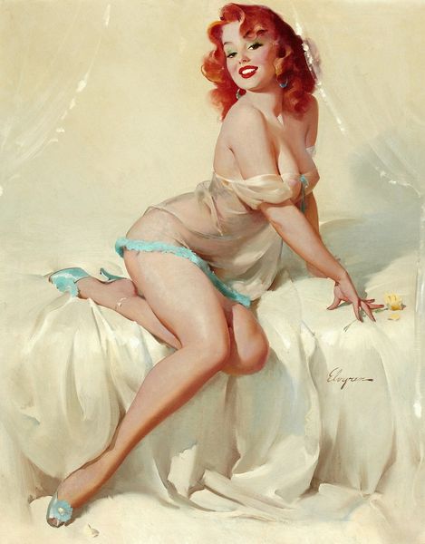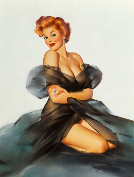 Curator: Immediately, the color strikes me. That powder blue backdrop contrasted with her fiery hair is really something. Editor: That’s Gil Elvgren’s "Roxanne," from 1960. Oil on canvas. A classic of mid-century American pin-up art. He was a master of crafting a very particular kind of image and female ideal, hugely successful through commercial channels. Curator: Commercial certainly comes to mind! There’s an element of fantasy. It’s undeniably idealized. Though I wonder how the meaning of this image has shifted for audiences today. Does she symbolize some outdated objectification, or something empowering now? Editor: Both, I suspect! It depends on who's looking. Consider the playful visual symbols. Her coy expression, that teasing pose with the feathered boa, it all evokes a specific kind of knowing feminine power. Also, this is not an ordinary nude. Look at her boudoir heels, she has style, elegance. Her upward glance is assertive, drawing the viewer into her own sphere. Curator: Assertive maybe within its era, wouldn't you say? To contemporary eyes, that self-assuredness is shadowed by her being presented as an object of desire, displayed in a way that’s constructed for the male gaze that certainly formed the core target of distribution channels that shaped visual culture at that time. Editor: And yet, redheads were often coded with a certain rebelliousness in art, far from docile figures. It’s a fine line, I agree. Even the boa…feathers have historically carried connotations of vanity, luxury, and even divine power depending on the cultural context. I see a very self-aware use of symbols, and it is all deliberately done. Elvgren knew the power of these visual cues, playing into those associations. Curator: And benefiting from them through mass circulation, yes. Though I see your point about a potential double reading through symbolism. A coy display of sexuality could imply agency too, however circumscribed within certain expectations of its period and audience. Perhaps in this work there’s more resistance than we might readily see on first glance. Editor: Art always works on multiple layers! Seeing her through a modern lens can make her feel even more alive as she connects us back to images and feelings across the long stretch of time. It feels good to discover nuances, after all.