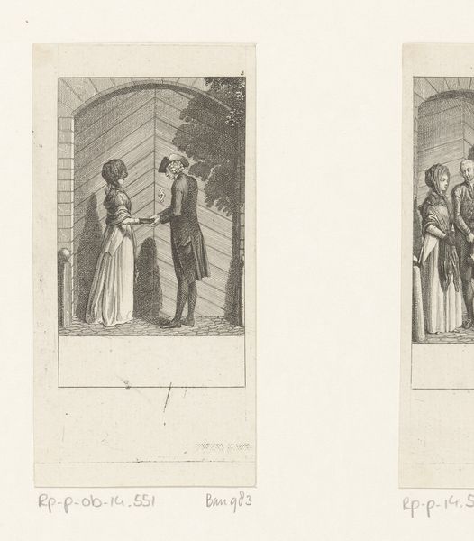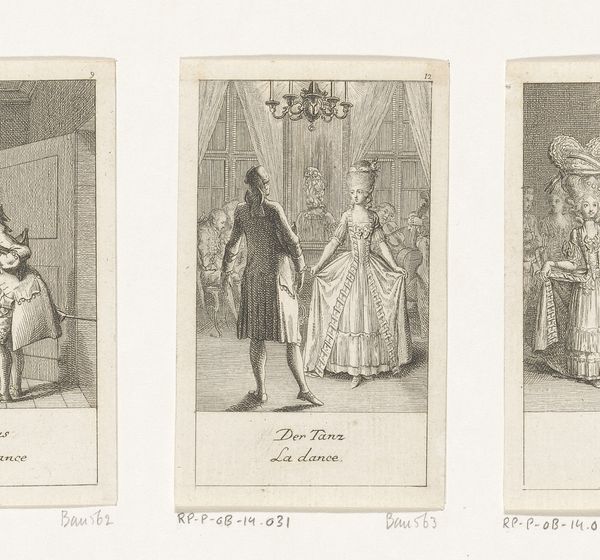 Editor: We’re looking at "Vier huwelijksaanzoeken" – Four Marriage Proposals – by Daniel Nikolaus Chodowiecki, made in 1781. It’s a print, an engraving actually, and it strikes me as a series of little theatre stages, each presenting a different flavor of courtship. There's a stark contrast in setting between each one, but also a curious formality that kind of flattens the emotional impact. How do you read this piece? Curator: Flattening… yes, like pressing flowers in a book to capture a feeling that's already gone. Chodowiecki was a master of observing social nuances. Notice how he differentiates each suitor. We go from rustic simplicity to bourgeois constraint to almost tragic self-importance – the last fellow in that grand, melancholic garden… almost as if he's about to be rejected. What I find truly interesting is the lack of true engagement. All of the "proposals" feel staged for an audience of unseen arbiters. Is that the case or it's my whimsical brain going again? Editor: That makes a lot of sense! Now that you mention it, the subjects almost seem like mannequins showcasing different approaches to marriage. Each little scene feels very performative. Curator: Precisely. Consider the time! This is just before the French Revolution. Social structures were about to be challenged as much as tastes in art, or clothing, or...love. There's a fragility to these "proposals" – and it's just delightful to imagine Chodowiecki grinning as he etched each line, fully aware that soon it would all seem impossibly antiquated. Don't you feel as if that's almost a satire, a very subtle social satire? Editor: Oh, definitely! Now I see the humor in the formality, almost as if the artist is winking at us. I initially missed that layer. Curator: That's the beautiful thing about art, isn't it? We are eternally evolving into it.