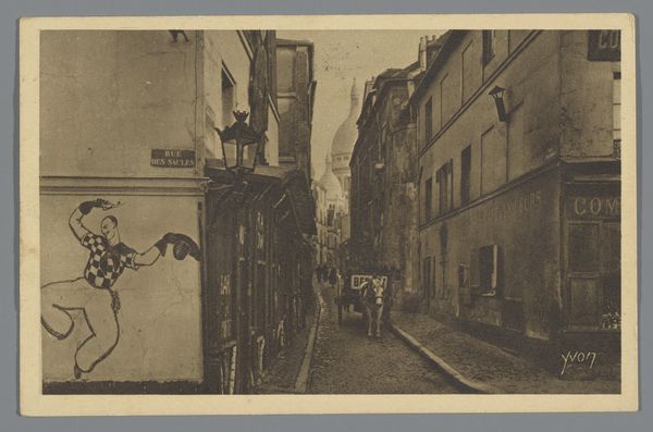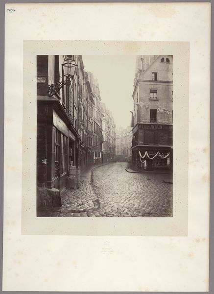 This etching captures a view of the Rue Renard-Saint Merri in Paris by Alphonse Louis Pierre Trimolet. The composition immediately draws your eye down the winding street, framed tightly by tall buildings on either side. The limited tonal range enhances the linear quality, emphasizing the architectural structure and the curve of the cobblestone street. Trimolet masterfully uses hatching and cross-hatching to create depth and shadow. The density of lines suggests the weight and solidity of the buildings, while the varying textures differentiate surfaces, from the rough stones of the road to the smoother facades above. The composition divides the scene into distinct planes, creating a structured and ordered view of Parisian life. This etching serves as an objective record and invites us to consider the relationship between the city's physical structure and our perception. The strict linear perspective and detailed rendering offer a sense of stability, yet the atmospheric quality implies the ever-changing nature of urban experience.