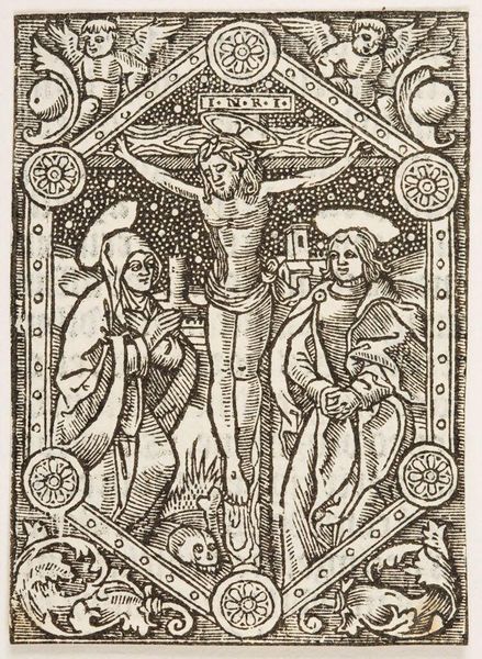 Editor: Here we have an anonymous woodcut print, "The Crucifixion; verso: Die Juden-Sau," with no date. It’s striking how stark the lines are, a real contrast of black and white. What story do you think it's telling? Curator: It's a narrative deeply entangled with antisemitism. The “Judensau,” or “Jewish Sow," image, often appearing on the reverse, was vicious propaganda. How does this context impact your interpretation of the Crucifixion scene itself? Editor: It's horrifying to think of the image on the back influencing how people saw the front. It taints the religious scene. Curator: Precisely. Recognizing the historical context allows us to critically examine the role of art in perpetuating harmful ideologies and inciting hatred. Editor: So, seeing the art isn't enough, we must understand it within its cultural moment. Curator: Exactly. This piece forces us to confront the dark side of art history and its impact on social injustice.