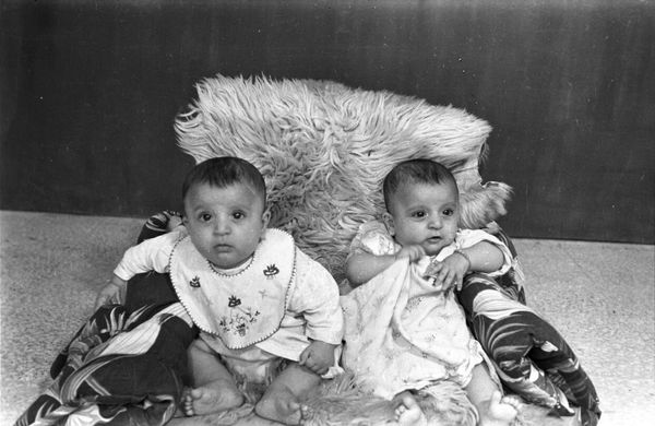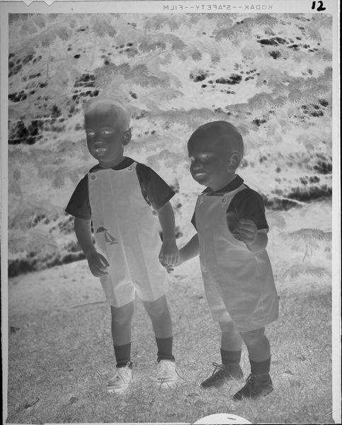 Editor: This untitled photograph by Lucian and Mary Brown shows two children in matching outfits. It’s quite small, only about 5 by 4 inches. What's your interpretation of this piece? Curator: The matching outfits immediately bring to mind societal expectations and constructed identities imposed from a young age. What does it mean to dress children identically, erasing their individuality? How might this image reflect the societal pressures of conformity? Editor: I hadn't considered the theme of conformity. Curator: It makes you wonder about the children’s agency. Also, how might the Browns' position as artists influence their decision to photograph these children in this way? Editor: I see it now. Thanks! Curator: Glad to share my perspective.