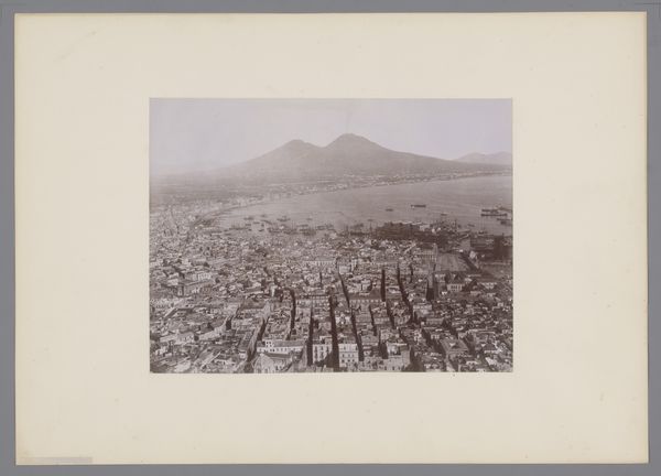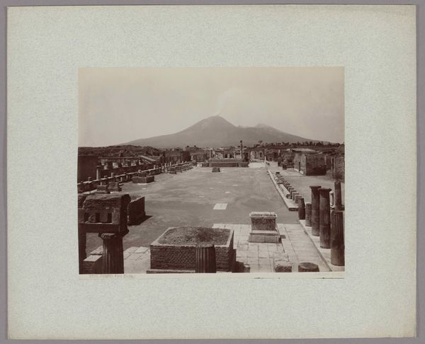 Curator: This is a gelatin-silver print by Giorgio Sommer, created sometime between 1860 and 1900. The work is entitled "Gezicht op de restanten van Pompeï met op de achtergrond bergen," or "View of the Remains of Pompeii with Mountains in the Background." It's a sweeping cityscape, capturing the haunting beauty of the ruins. What strikes you most about this view? Editor: The silence. Even though there are buildings, and signs of life in the distance, there's an incredible stillness. The geometry of the remaining walls juxtaposed with the organic curve of the distant mountains almost makes it feel staged, like a theatre set after the final curtain. Curator: Yes, that stillness is palpable, isn't it? Photography, especially in the 19th century, has this incredible power to arrest time. Consider Pompeii itself; it was stopped in time by Vesuvius' eruption in 79 AD. This photograph captures a later moment, but it evokes a similar sense of frozen history. Editor: Exactly! The ruins become a symbol of the transient nature of human achievement. It makes you wonder about all the little lives lived here, the daily routines… Now it's all just whispers and shadows. The shadow of Vesuvius hangs over the image still. Curator: Indeed. It’s hard not to see Vesuvius looming in the background as a potent symbol. The photographer has carefully framed the shot to create this lasting impression of this shadow. Giorgio Sommer captured many images of Southern Italy. Through these, we can witness 19th-century ideas about ruins. Ruins had become picturesque; souvenirs from antiquity that confirmed contemporary narratives of European history. Editor: Do you think Sommer intended to invoke that sense of faded grandeur, or was he simply documenting what was in front of him? Perhaps there's no simple intention. I always find that landscape photography becomes automatically allegorical; there’s an implied comment, no matter how small, of nature’s dominion. Curator: A telling question. There is often more than one truth coexisting. What this photograph says about ruins, tourism, and history is also affected by our own position as viewers, today. These ruins once formed part of people's homes and were eventually rediscovered in the modern era. Perhaps this image reflects how human intervention and perception consistently create "new" readings of the past. Editor: So beautifully said. It gives you so much to think about. What do we carry of the past into our present and future? Curator: Yes. Thank you for that evocative closing sentiment, It encapsulates much about this compelling image and indeed how we view the remains of human history.