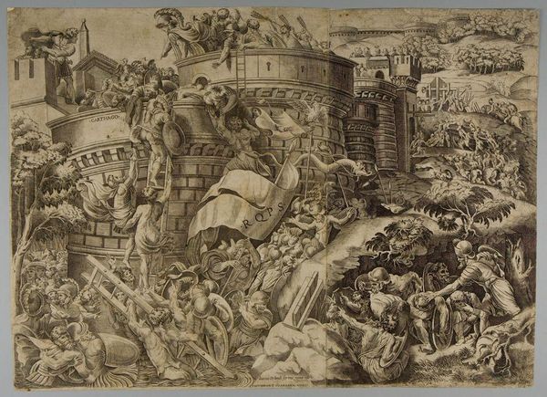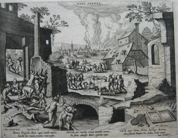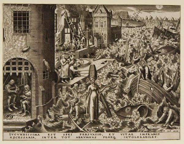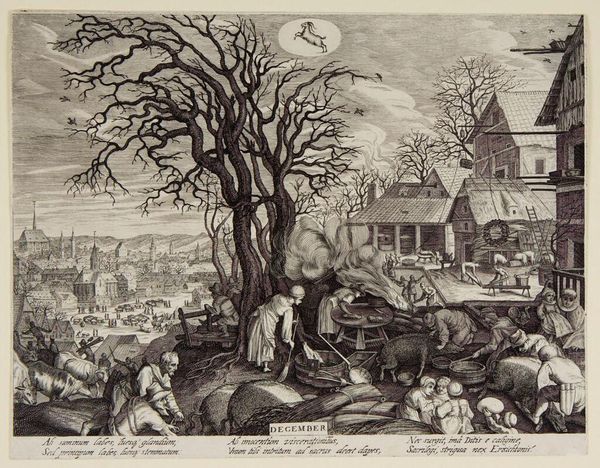 Editor: This is Pieter Bruegel the Elder's "Prudence," an engraving. The scene is bustling with activity, and the sheer amount of labor depicted is striking. How does this depiction of work relate to the concept of prudence? Curator: Well, from a materialist perspective, we can see how Bruegel’s Prudence ties into the economic realities of the 16th century. The detailed rendering of labor, from harvesting to preparing food, highlights the means of production necessary for survival. How does the print challenge traditional notions of "high" art by focusing on these everyday activities? Editor: I guess it elevates the ordinary, showing the value and skill involved in work often overlooked. I never thought about prudence in terms of labor before. Curator: Exactly. Bruegel prompts us to consider how prudence isn't just about abstract virtue, but about the very material processes that sustain life.