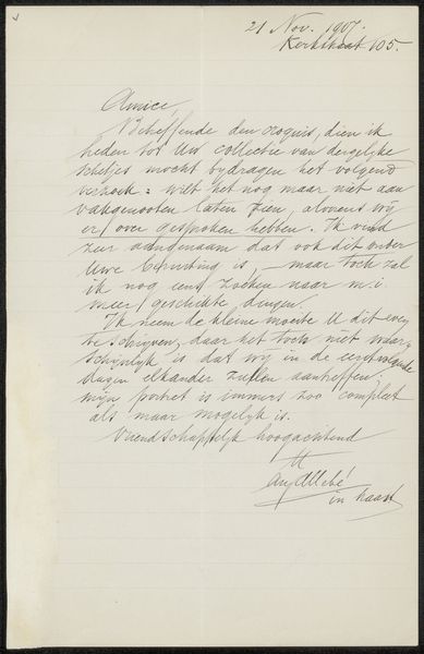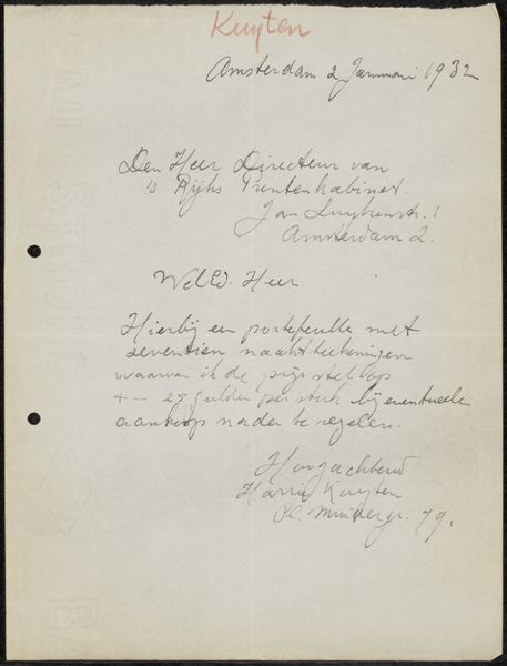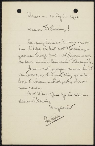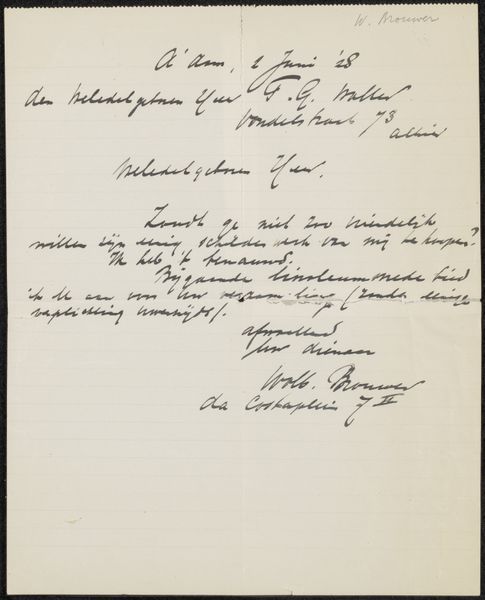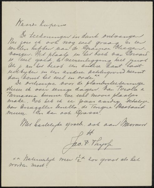 Curator: This piece is titled "Brief aan jonkheer Hendrik Teding van Berkhout (1879-1969)," or "Letter to Jonkheer Hendrik Teding van Berkhout." It's attributed to Simon Moulijn, likely dating from 1932, and resides here at the Rijksmuseum. It’s a pen and ink drawing on paper. Editor: My immediate thought is of intimacy, almost intruding on someone's personal correspondence. The handwritten script and the informal nature of a letter evoke a sense of closeness and vulnerability. Curator: Absolutely. Epistolary exchanges offer rich insight into historical periods and power dynamics. Van Berkhout, the recipient, was of the Dutch nobility, immediately signifying privilege and a particular social stratum. Moulijn, a well-regarded artist, initiates this conversation, pointing to the role of patronage, influence, and the very different currencies they both bring to the table. Editor: I'm drawn to the graphic quality of the letter itself. The deliberate slant of the handwriting, the variation in line weight - these aren't simply functional. They become visual elements. It reads as though there are layered power structures present, while this personal communication is visually pleasing. It is both vulnerable, personal and aesthetically powerful at the same time. Curator: Precisely! And consider where a letter sits within a network. The institutions, social mores, and personal connections. It's not merely a document; it embodies communication within very tight circles of Dutch society at this moment in time. How could class barriers affect an artist like Simon Moulijn trying to navigate the art world in 1930s? Editor: Thinking about this letter being displayed now… It seems to comment on ideas of authorship, communication and accessibility in art history. A contemporary lens may give voice to previous power discrepancies that this simple note doesn't immediately illustrate. Curator: Yes, what we're observing here through this interaction goes far beyond ink on paper; these seemingly quiet artworks offer so many intersectional perspectives if we ask them the right questions! Editor: Exactly, now I see this humble looking letter as much more complex than its handwritten note suggests.