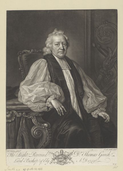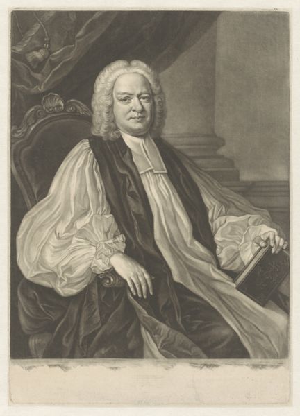 Curator: This is "Portret van Richard Osbaldeston," a print created by James McArdell between 1747 and 1762, now residing in the Rijksmuseum. Editor: The first thing that strikes me is the incredible detail rendered in this print. The soft, flowing lines of his wig contrast with the heavy folds of his robe—it's a study in textures, really. Curator: Absolutely. This piece captures Osbaldeston at a time when the Church of England held significant social and political sway. Notice how his attire signifies not just religious authority, but also reflects the socio-economic status afforded to high-ranking clergy. The portrait serves almost as propaganda, reinforcing societal hierarchies. Editor: It's fascinating how McArdell, working with engraving techniques, conveys such a sense of volume. Think about the labor invested here—each line meticulously placed. And consider the paper itself, the materials involved in both the creation and the potential mass distribution of this image. It speaks to a growing culture of accessibility, even to portraiture. Curator: I'm struck by the almost performative aspect of his pose. It is intentionally constructed. Osbaldeston is projecting an image of power and intellect. His gaze, his posture, all contribute to the narrative of the established, ruling elite. This print exists within the context of the enlightenment and emerging ideas about class and authority. Editor: The details matter, for sure. Even the paper quality plays a role. Was it widely distributed? How many impressions were made? Considering printmaking's social reach lets us see it less as a singular art object and more as an agent within a complex web of production, dissemination, and, potentially, social change. Curator: Indeed, while McArdell likely aimed to memorialize and perhaps ennoble Osbaldeston, our modern view allows us to question the systems of power and representation embedded within the piece. The work provides rich insight into gender and power dynamics in that era. Editor: Thinking about McArdell’s craftsmanship reminds us that even within seemingly straightforward portraiture, there is immense technical skill. Looking at the crosshatching, the gradations of tone… It makes us appreciate the value of specialized, often unacknowledged, labor involved in artmaking. Curator: Examining "Portret van Richard Osbaldeston" opens a discussion on identity, social stratification, and the nuanced ways power manifests within portraiture, providing vital commentary on 18th-century society and representation. Editor: Precisely, by centering on material reality and the process involved, we unveil the complex social relations that shape its meaning beyond a mere depiction. It offers insights into material production, networks of distribution, and their lasting impact on cultural representation.