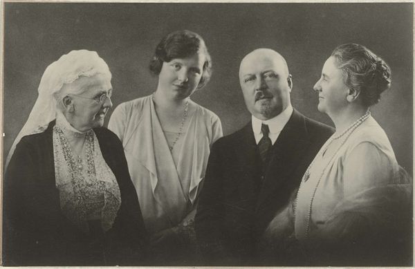 Editor: We're looking at "Portret van mevrouw Hondius-Crone en haar kinderen," a photograph from 1935 by Toni Arens-Tepe. It's a gelatin-silver print, showing a mother with her three children. The children are all looking in different directions. There's a formality, almost a stiffness, to the pose, yet something quite vulnerable in their faces. What do you see in this piece, in terms of its symbolic language? Curator: I see the performance of family, how we codify our roles through portraiture. Think of the lace collar on the mother, a visual signifier of domesticity and refinement, consciously juxtaposed with the austere background. What does that visual dichotomy communicate about the sitter's internal life, and also about societal expectations? Editor: So, the carefully chosen clothing acts like a costume? Curator: Precisely. Each carefully chosen element tells a story. The gaze, as you mentioned, directs our reading of this group dynamic. Consider how that gaze breaks—some direct, some averted. Is this generational tension or a studied ambivalence the photographer wanted to convey? Look at the elder son and his downcast eyes, which speaks volumes. Editor: The averted gaze, you mean? Perhaps representing unspoken desires? The children on the right, their eyes show fear. This must mean that what surrounds them oppresses them. Curator: Perhaps. Their expressions suggest there's so much under the surface of familial performance. And how can the materiality of a gelatin-silver print speak of cultural memory itself? Its tones and clarity solidify not just a likeness but our conception of a generation in monochrome clarity. Editor: That’s a really insightful point. It almost elevates a simple portrait to something grander: a snapshot of a whole society and time, rendered through clothing and those expressive faces. Curator: The symbols reveal collective longings. I learned how context and medium coalesce to construct a reading across the historical divide.