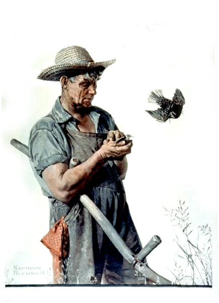 Norman Rockwell made this portrait of a coal miner, called "Mine America's", with oil on canvas. The color palette is mostly dark browns and grays, punctuated by the bright light on the miner's helmet, and the process seems to capture a very honest, human moment. The texture of the paint is smooth, yet it captures the rough, weathered look of the miner's face. The shadows cast by the miner's hat emphasize the lines etched into his face, and there's a real feeling of warmth and authenticity. Take a look at the miner's smile, it's not overly joyful but it has a sort of kind, hopeful quality. You can almost feel the weight of his labor, yet there’s also a resilience in his expression. Rockwell was an illustrator who often focused on idealized scenes of American life, but in this work he shows the grit and dignity of working people. Think of Lucian Freud who also painted portraits of people with an interest in their physical presence and the story it tells. Art’s always echoing, isn’t it? It’s up to us to listen.