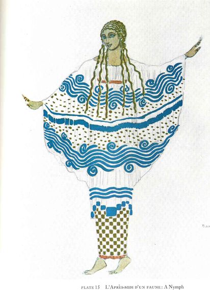 This costume design of a nymph was made by Léon Bakst for Debussy's ballet, "L’après-midi d’un faune". It is a piece that really celebrates process, a kind of controlled spontaneity. Bakst uses simple shapes, flat colors, and distinct outlines that suggest both classical restraint and art deco playfulness. The texture is pretty flat, but there’s a lightness to it. It's like he is thinking through the design, letting the shapes fall into place, creating a real harmony between the figure and the costume. I love the green wave motifs on the bodice, they remind me of Hokusai and also Matisse cut outs, it's cool how Bakst mixes them with those Greek-key inspired geometric patterns. The color palette is fresh and balanced, with the bold green and blue offset by that creamy white. This piece speaks to how visual ideas travel and evolve across time, proving that art is a never-ending conversation.