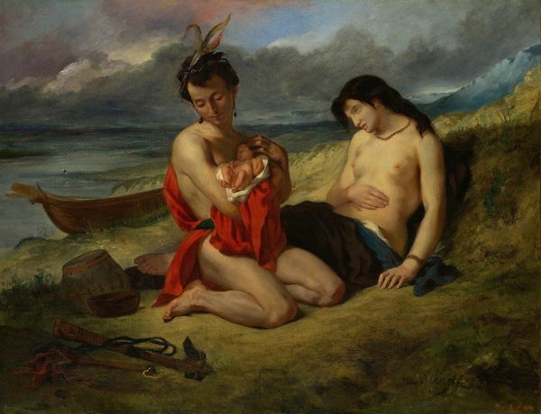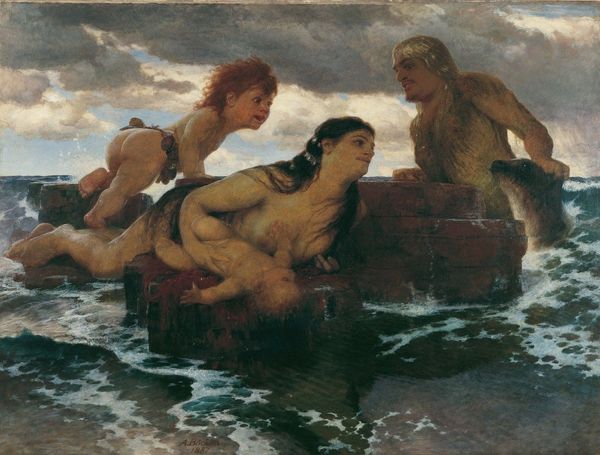 Curator: This is Ditlev Blunck’s painting, “Manhood. From the series: The Four Ages of Man," created between 1840 and 1845. It's oil on canvas and resides here at the SMK. Editor: Well, my immediate reaction is… unease. The figures look posed, almost staged, in their boat, amidst a tempestuous sea. There is such a peculiar stillness about it all that contrasts strangely with the turbulent setting. Curator: That tension might stem from Blunck’s context. As an academic painter, he straddled the line between Romanticism and Realism. This piece, in particular, reflects the artistic and societal pressures of the Danish Golden Age. Consider the materials: the carefully rendered canvas, the layering of the oils – all pointing towards a constructed, rather than spontaneously created, experience. Editor: Interesting. I'm drawn to the almost theatrical composition. Look at the characters: a stern, near-nude man gripping an oar, a melancholic woman cloaked in blue. They evoke a historical and almost allegorical sentiment, reflecting a Danish academic art style within specific schools and their aesthetics. It looks like a genre painting. Curator: Absolutely. He trained at the Academy, absorbing the conventions while simultaneously participating in debates around national identity and artistic purpose. Notice how the lighting emphasizes their musculature, particularly the man's, which adds to a sense of idealized virility, practically romanticizing labor. Editor: And consider where this piece hung, the public it addressed. Museums played a vital role then, shaping public taste and reinforcing narratives about Danish history and cultural values. It speaks to the institutional forces influencing not just art production, but the very construction of national identity at the time. Curator: Precisely. And look at the detail in the decorative trim of the boat itself. What does that tell us about the artisan and craft labor employed? How might Blunck’s studio have operated? Editor: It invites us to see art as an product of complex material and social networks. Reflecting on Blunck's 'Manhood', I'm intrigued by the way this artwork participates in constructing, or maybe even questioning, ideals of masculinity. Curator: It brings to the fore the intricate interplay between process, materials, and societal ideologies encoded within art objects of this era.