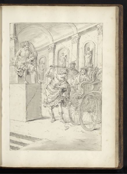 Curator: Looking at this drawing, it evokes a sense of quiet solemnity, wouldn't you agree? A serious occasion is clearly underway. Editor: Absolutely. And Leonaert Bramer's "Alexander the Great Elected Supreme Commander," dating from around 1655-1665, indeed depicts a moment of great significance. The tension is visible. Curator: Tell me more about the visual language. The repeated window shape, those strong vertical lines of the columns – what do these structural elements convey? Editor: For me, it’s the feather on Alexander’s helmet and the way it echoes those window mullions. It's about power, certainly, but also lightness, aspiration…almost a fragility attached to leadership. Notice how his gaze is directed upward, towards something beyond the present moment of election. That motif recurs throughout representations of Alexander, who came to represent both supreme earthly power, and hubris, reaching for the divine. Curator: I appreciate that perspective, however I also want to draw your attention to those figures seated on the left, one seemingly asleep on the bench. How does their presence challenge traditional ideas about military authority? Does it expose some ambiguity or contradiction within the concept of heroic leadership? What commentary is being made about popular leadership and whether we see leaders that look like us? Editor: That’s a fascinating counterpoint! I had perceived him more as overcome by the gravity of the moment, a silent observer rather than a dissenter. But your reading introduces a powerful element of critique. But observe how all figures on the left all gesture in one single unified direction to Alexander, as though in awe, agreement, or hope that he will take them to a new dawn, whatever the new age would look like. Bramer often engaged in complex narratives, after all. Curator: These figures in the foreground all do offer complex commentary, particularly those rendered with what could almost be interpreted as nonchalance towards the election taking place before them. It really underlines Bramer’s critical eye in exploring themes of power, choice, and social dynamics. It really brings forth the political commentary of the day. Editor: Precisely! It shows that symbols are multifaceted and contextual. Thank you, it helps enrich how we decode the visual language in art. Curator: Agreed! This piece really prompts us to reflect on the nature of leadership itself, then and now.