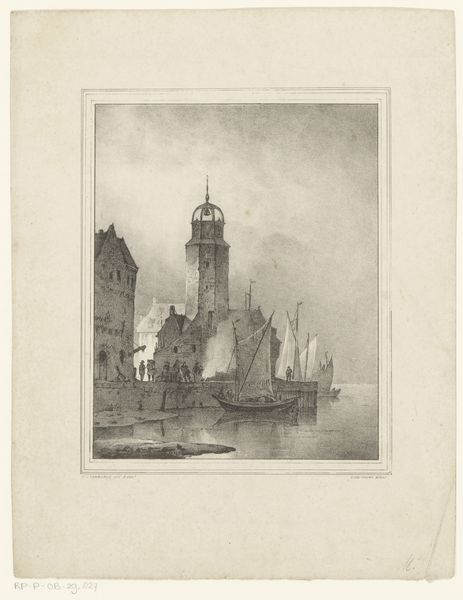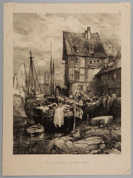 Editor: This is Eugène Isabey's "Intérieur d'un port," housed here at the Harvard Art Museums. It's a print, a bustling scene in shades of grey. What strikes me is how much is happening in such a small space. What do you make of this image? Curator: It's a fascinating glimpse into the 19th-century fascination with the working class, specifically the maritime industry. Consider how images like this might have functioned: romanticizing the everyday lives of laborers for a burgeoning middle class, while also perhaps obscuring the hardships inherent in such a life. Do you see any clues about the social standing of these workers? Editor: I suppose their labor-intensive activities and simple clothing suggest a lower status. I hadn’t considered how the image itself participates in constructing that status. Curator: Exactly. And we must consider the artist's positionality, his intended audience, and the broader socio-economic context in which the print was created and consumed. Editor: That gives me a lot to think about in terms of the politics of imagery. Curator: Indeed, and understanding that is key to unlocking so much of art history.