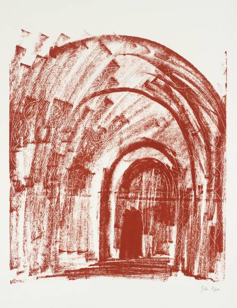Curator: Standing before Anselm Kiefer's "Sulamith" from 1983, what strikes you first? The artwork is a powerful mixed-media piece incorporating acrylic paint and architectural elements. Editor: Gloom, actually. This subterranean architecture feels oppressively heavy. It’s as if the arches are closing in, almost burying you alive in the brick. The limited palette deepens this sense of foreboding and makes one focus on structure, rhythm and decay. Curator: I see it too. It's interesting you picked up on the subterranean aspect because it portrays the interior of the synagogue in Berlin designed by Edwin Oppler that was destroyed during the Nazi regime. Kiefer felt an obligation, almost, to keep those shadows alive. Editor: Ah, that shifts everything. I was locked onto this aesthetic reading of ruin, texture, light and shadow, which definitely persists. But the specific historical context… the layered bricks become inscribed with collective memory. It's no longer an arbitrary space. It’s charged. How does he create that feeling in his medium, or is this just us injecting what we know into it? Curator: I think it’s very much built in. The thick application of paint and incorporated materials makes the surface rugged and textured, echoing the worn, damaged structure itself. Then the use of brown hues adds this overwhelming weight that hints at mourning, while also highlighting the way buildings tell stories themselves through their decaying forms. Editor: Do you find he leans on certain cues like form and the natural decay of mediums, knowing these details will cue certain affects? The architecture is very Roman, that would carry certain implications to anyone with any art history knowledge. Plus the title of the piece alludes to Paul Celan’s poem about Sulamith who was murdered in Auschwitz. Curator: Absolutely, but for me the architectural setting does the same. Architecture isn’t ever an isolated entity; it's always intertwined with history, ideology, power… Here, Kiefer utilizes architecture as a stage upon which to play out narratives of loss, remembrance, and, perhaps, the impossibility of forgetting. The material gravity becomes a kind of emotional gravity. Editor: So, we circle back. Whether intuitive, formal, or something in between, there’s something elemental and deeply tragic. The heaviness sticks with you. Curator: Exactly, the gravity of history made visible, forcing us to remember, reflect, and perhaps, rebuild.