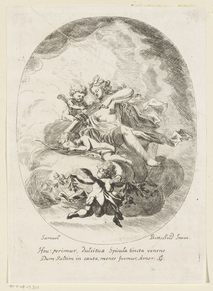 Curator: The allegorical nature of this image is so strong; it practically radiates symbolic meaning. Editor: Indeed! It's quite luminous for an engraving, isn’t it? I get a strong sense of bounty and perhaps regal power, but also... a controlled heat, if that makes sense. Curator: It does. We’re looking at a work entitled “Personification of Summer,” made sometime between 1710 and 1725 by Marie Jeanne Renard du Bos. The engraving style places it firmly within the classical realism style, showcasing a Baroque flair. Editor: Ah, I can see the Baroque influence in the theatricality of the composition. She sits upon the clouds almost like a goddess. The lion seems… less a beast and more a powerful throne? And the putto with the scythe only heightens the sense of orchestrated grandeur. What could the image say about social and political currents? Curator: The historical context is crucial. Consider the socio-political functions of Baroque art: powerful people were visually associated with wealth, religion, and power. In what ways were women granted a similar power in the visual field, if at all? To depict Summer in such a way certainly elevates the season— and perhaps those who could profit from it —to near-mythic status. But how might class relations come into play as well? Does this image portray a "summer" available to all? Editor: An interesting point. And of course, the season has historically provided a lot of work to field-hands. It's easy to see her now not only as an idyllic picture but also a symbol of labor politics! How these paintings ended up in museum collections is political as well! Curator: Absolutely! This kind of art served particular functions and served particular interests within its time. But looking at how it translates and impacts modern sensibilities, that, too, becomes a vital act of critique. Editor: These layered readings really do unveil how an apparently straightforward depiction, even of something as seemingly innocuous as ‘summer’, reveals itself as embedded within intricate power dynamics. Thank you, Curator! Curator: The pleasure was mine! Thank you, Editor.