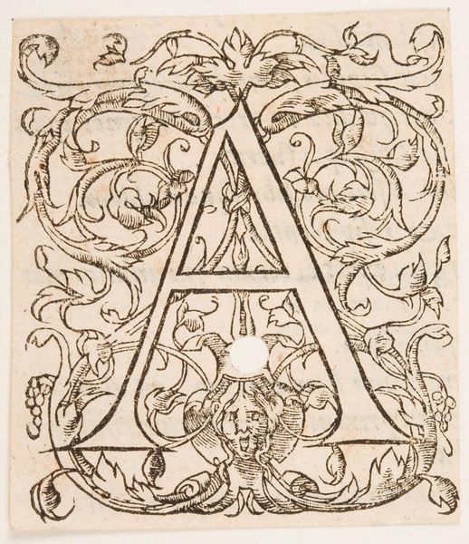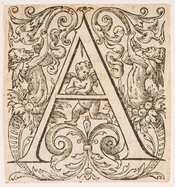 Editor: This is "Letter A," an anonymous piece from the Harvard Art Museums. I'm immediately struck by its elaborate design within such a small space. What formal elements stand out to you? Curator: Note how the rigid geometry of the letter 'A' is counterpointed by the organic, curvilinear forms that surround it. The tension created by this juxtaposition is further amplified by the stark contrast of black ink on the off-white paper. Do you perceive a deliberate visual hierarchy? Editor: Yes, the 'A' commands attention, but the eye also wanders to the cherubic figure nestled within the letter's apex and the stylized birds. I wonder about the artist's intention. Curator: Perhaps less about intention and more about the visual relationships at play. The balance of positive and negative space, the repetition of shapes—these formal considerations guide our reading of the artwork. Editor: That's insightful. Focusing on those relationships really does give a fresh perspective. Curator: Indeed. By bracketing out considerations of “meaning” and “intention,” we are better able to appreciate the intricate interplay of form and line.