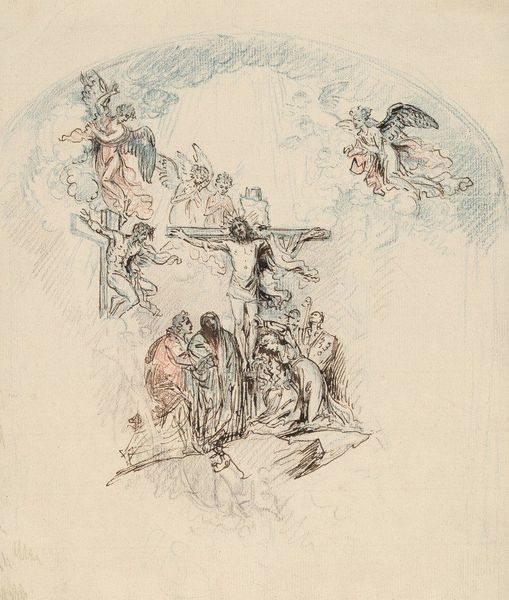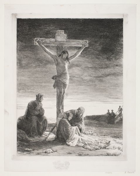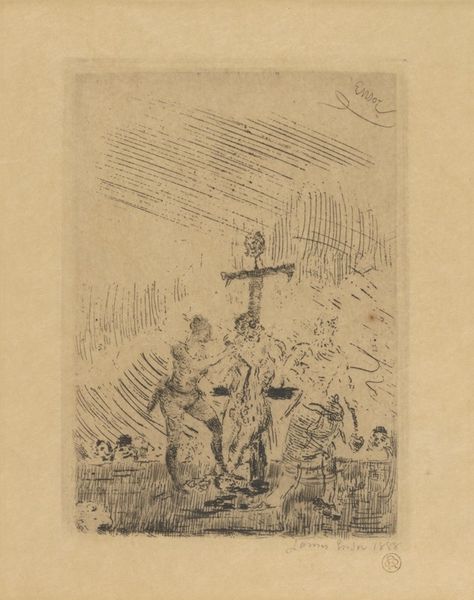 James Ensor etched "Christus door duivels gekweld," depicting Christ's crucifixion amidst tormenting figures. The cross, a symbol of sacrifice, stands starkly against a chaotic scene filled with jeering figures and skeletal demons. This image is a potent manifestation of the enduring theme of human suffering and divine trial. The motif of the crucified Christ recurs throughout art history, from Byzantine icons to Renaissance paintings, each iteration reflecting its cultural milieu. Ensor's grotesque figures echo the demons found in medieval art, embodying the basest aspects of human nature. These figures are reminiscent of the diableries found in the margins of illuminated manuscripts. The mask-like faces, a common element in Ensor's work, add a layer of psychological depth, suggesting hidden intentions. Ensor's etching taps into our collective memory, stirring deep-seated fears and anxieties. The image resonates with a primal understanding of sacrifice and suffering, a timeless narrative that continues to evoke emotional responses. It reflects humanity’s cyclical obsessions with death, redemption, and the grotesque, forever resurfacing.