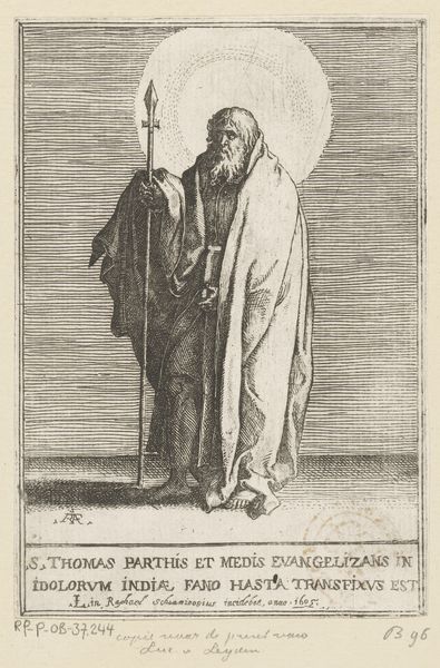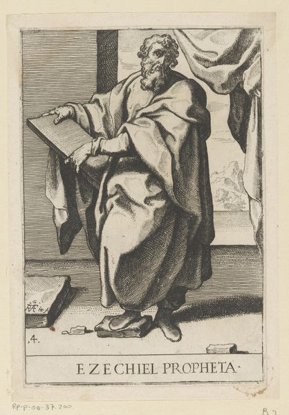Curator: Standing before us is “Profeet Jeremia,” or "Prophet Jeremiah," an engraving crafted in 1609 by Raffaello Schiaminossi, currently residing here at the Rijksmuseum. Editor: Ah, Jeremiah, looming in monochrome! There's something rather theatrical about him, draped like that. It reminds me of a stern father about to deliver some unwelcome truths. The way he points a single finger skyward, very accusatory! Curator: Precisely. The baroque drama is certainly potent, and I think you are quite right; the finger enforces a directional weight to the entire piece. And observe the contrasts created in the cloak—how do you feel about that? Editor: It's an intense study in chiaroscuro. The fabric folds cascade like miniature mountains, all strategic ink placement giving weight. Schiaminossi really coaxed out a lot with engraving alone, it gives it a depth, wouldn’t you say? It feels both heavy, but yet the character remains somewhat gentle. Curator: An astute observation! Consider Jeremiah's gaze: despite the commanding gesture, there's a weariness, a sort of profound sorrow etched into his features. Almost an unwillingness to be so authoritarian; do you agree with that assessment? Editor: I absolutely concur. This isn't just a shout of religious fervor but a weary declaration. The mountain backdrop beyond the curtain echoes this melancholy – bleak but enduring. One senses a profound sense of responsibility. Curator: Perhaps even the weight of knowing that your message may fall on deaf ears. The baroque artists were brilliant and drawing emotions with such directness, it is something modern artists may strive for even today. Editor: Yes, this little piece captures a lot of emotion in what seems such a small composition! Seeing how a piece created over four-hundred years ago is really inspiring. The emotional thread feels very unbroken and intact.