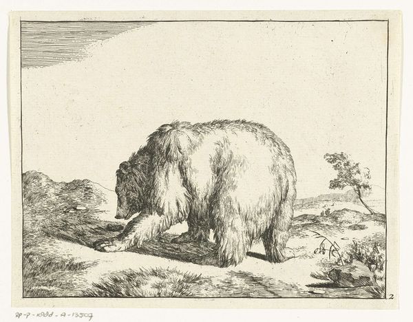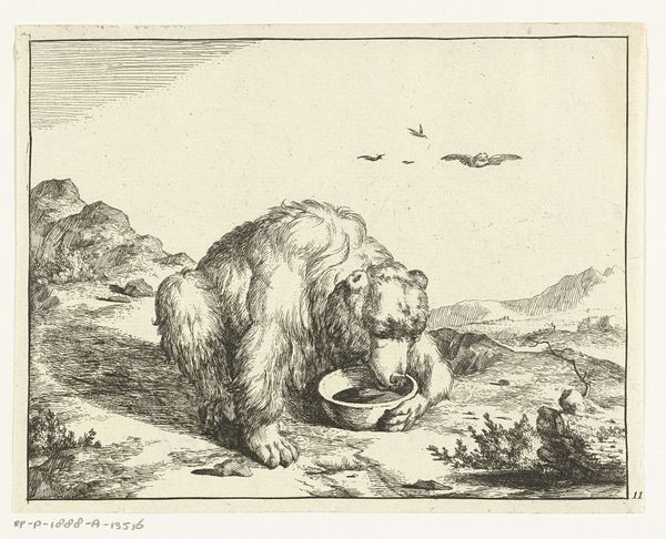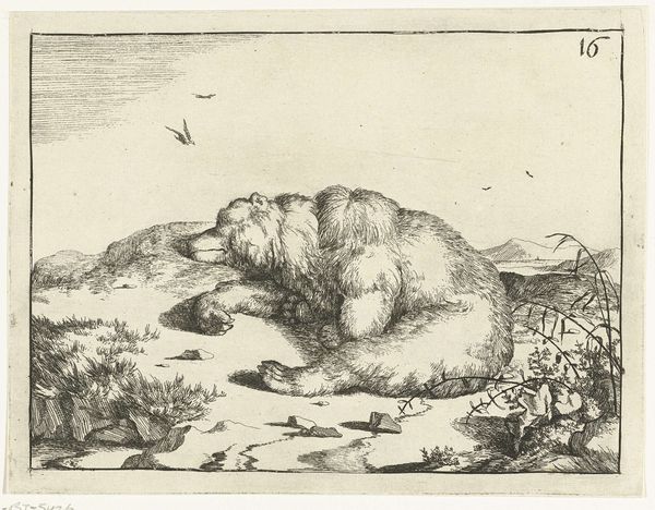 Curator: Look at the almost nonchalant detail in this 1664 engraving by Marcus de Bye titled "Liggende beer, iets etend uit zijn linker poot" currently housed here at the Rijksmuseum. The texture rendered is astonishing. What do you think? Editor: My first impression is that it's simultaneously peaceful and melancholic. The bear, lying alone in what seems a vast landscape, has an undeniable air of vulnerability despite its size. There's something almost post-apocalyptic about the emptiness. Curator: The technique here is truly something. Consider the use of etching, for instance. We’re seeing controlled corrosion to bite the image into the plate, revealing a complexity often found in his depictions of animals within broader, imagined landscapes. Were they inspired by actual observation of bears or from some popular lore of the era? What was bear ownership like during that period, and could there be socioeconomic commentary embedded in the display of the bear, who we see feeding on something it’s holding in its left paw? Editor: Exactly. Think about the socio-political position of humans and animals during the baroque period. Bears represented both the wild and a resource. I wonder if de Bye's bear speaks to Dutch colonialism’s impact, as animals were trophies or resources exploited from colonized lands. Does this bear eating reflect a natural right usurped or simply the lonely state of domination and subjugation that occurred in the landscape? Curator: Furthermore, consider the printmaking processes themselves. Who had access to this art form, and how did it circulate these kinds of images? Was the labor divided based on master craftsman or distributed? Editor: That makes me think about this as a commodity too—engravings are reproducible. Who was the intended audience? Did this image challenge or reinforce ideas of class and the relationship of human society with what we still othered as "wilderness"? Curator: It certainly prompts more questions about access, labor, and viewership when encountering this engraving within this contemporary setting. Editor: Absolutely. It really asks us to reconsider those power dynamics across time, to contemplate both what is immediately visible and what histories we bring with us into this gallery today.
