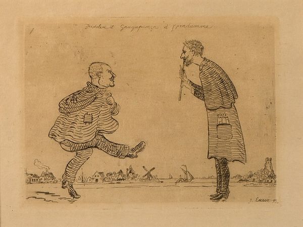 Curator: Immediately, the sheer size and darkness of Goliath dominates. Is it the lighting, or does the lithographic process emphasize such stark contrasts? Editor: Daumier uses stark lines and a sense of immediate action that really heightens the tension. The materiality of lithography, its reliance on the push and pull of grease and water, mirror the dynamic between the powerful Goliath and the seemingly insignificant David. Curator: The visual dynamic is clear. Goliath, almost bursting out of the frame, holds a ridiculously large sword; a clear symbol of dominance, while David prepares his slingshot. We are viewing Honoré Daumier's, "David et Goliath," a lithograph dating to circa the 19th century. How does it speak to us beyond the biblical narrative? Editor: Looking at this through a material lens, consider Daumier’s choice to use lithography, a then relatively new and accessible medium. It speaks to broader access to visual media and satire, connecting biblical grandiosity to everyday consumption and understanding. Curator: True, this wasn't meant for a private collection but for mass circulation, and with it, his scathing commentary. His figures feel cartoonish but not without a certain dramatic intensity. Goliath's distorted, anxious expression disrupts the expected reading of divine justice; that distortion undermines authority and grandeur. It becomes more than just caricature, though, doesn't it? More a psychological snapshot. Editor: Absolutely, and the printing process would influence distribution; the economics dictated a certain scale and scope. The physical weight of those printed sheets carrying Daumier's critique, spreading rapidly across societal spheres...it becomes part of the meaning. Curator: I hadn't thought about the "weight" in that sense, fascinating. For me, the continued resonance hinges on this very simple symbolic narrative. The idea of the underdog, fueled by righteousness, overcoming might; and Daumier capturing the fear even within the mighty. It speaks to the inherent vulnerability in positions of power, which explains the historical significance. Editor: Indeed. Examining this work really underscores how materials, printing practices, distribution, even contribute to its overall political charge. Curator: Seeing the symbolism through this prism really clarifies the message about unchecked power. Editor: For me, it underscores how Daumier uses these materials, essentially, to build something monumental.