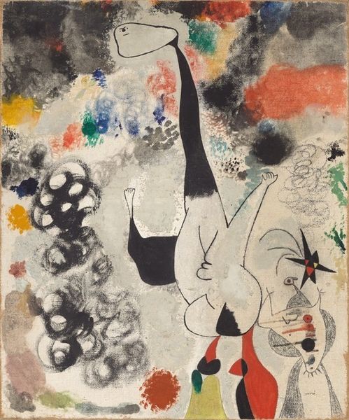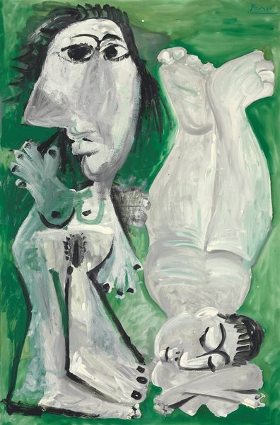 Editor: So, this is Picasso’s *Le peintre et son modèle*, from 1964. It’s an oil painting, and it immediately strikes me as incredibly raw in its presentation of the artist and the nude model. What do you see happening in this painting? Curator: I'm interested in how Picasso presents the act of creation. Consider the materials: oil paint, canvas, brush. These are traditional tools, yet he disrupts tradition. Look at the flatness, the crude application. It speaks to a frantic pace, a direct, almost violent engagement with the materials. Editor: Violent? How so? Curator: The paint is applied in thick, gestural strokes, the figures are fragmented, almost deconstructed. It's not about beauty; it's about the physical struggle of representation. Think about the socio-economic context – post-war Europe, a boom in art commodity, and Picasso as a brand. Does this rawness become a calculated move, an artistic statement against polished perfection, accessible only to certain audiences? Editor: That’s a provocative idea! So, are you suggesting the “violence” is a reaction against the commercialization of art? Curator: It's a consideration. Picasso was keenly aware of his position in the market. He controlled production and consumption. This painting could be read as both a critique and an embrace of his power within the art world. Editor: I hadn’t thought of it that way before. I was too focused on the subject matter, not the social forces shaping its production. Curator: Exactly. Material analysis pushes us to question the role of the artist, the value of labor, and the relationship between art and capital. Hopefully that adds another layer for our listeners.