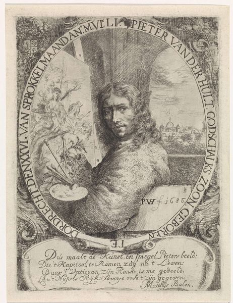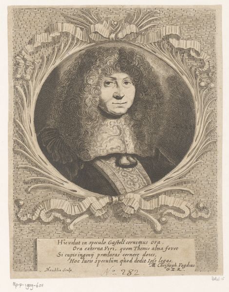 Editor: This is an engraving, "Portret van Caspar Stieler," dating somewhere between 1668 and 1720 by Johann Alexander Böner, currently at the Rijksmuseum. It’s so intricate! What strikes me are the oak leaves and acorns framing the portrait. What do you make of that imagery? Curator: The oak, throughout European history, carries immense symbolic weight. Think of the ancient Celts, or even later, Germanic cultures; the oak signified strength, endurance, and wisdom. That Caspar Stieler is framed by oak leaves and acorns tells us he probably possessed those qualities, or at least, that the artist wished to portray him as such. Consider also the time in which it was made – were there any political implications to using oak leaves and acorns during this period? Editor: Political? I hadn't considered that. Is the inclusion of oak specifically related to Germany? Curator: Yes, and the personal crest in the upper right might offer some clues, too. These details aren’t just decorative; they’re carefully chosen symbols that speak to Stieler’s identity and place in society. Have you tried deciphering the writing on the bottom cartouche? It looks as if it is another signifier for what the sitter values or what qualities he possessed. Editor: I haven't. It's German, I think. But this makes me look at portraiture differently. It's not just about likeness, it’s about constructing an image through symbols. Curator: Precisely. And remember, even seemingly small elements contribute to the overall message, creating a layered cultural memory for future generations. These images serve as more than just portraits; they are narratives frozen in time. What new questions did it bring up for you? Editor: Definitely about deciphering symbols and how much they can reveal about the sitter's context, which I will keep in mind. Thanks for opening my eyes to that! Curator: My pleasure! And keep that curiosity alive.