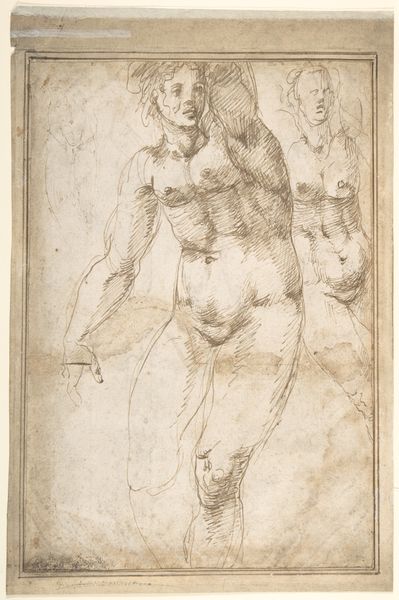 Curator: This is "The Baptism of Christ," a drawing likely made sometime between 1500 and 1600, attributed to Guglielmo Caccia, also known as Moncalvo. It is currently held at the Metropolitan Museum of Art. Editor: My first impression is one of preparatory sketch – the figures are lightly rendered in pencil and charcoal, suggesting an artist working out the composition and details for a larger work. There's a real rawness in the depiction of the human form here. Curator: Absolutely. Think of the social implications of such a commission at the time. The Renaissance was experiencing seismic shifts in thought and devotion and we are only decades from the height of the Reformation and the beginnings of the Counter-Reformation that would follow. These theological arguments play out in the commission and re-telling of these stories. Editor: I'm intrigued by the use of charcoal and pencil together. It’s an interesting combination of materials. One adds depth, almost like a sculptural element defining musculature while the other provides for fine outlines. It gives a dynamic quality, highlighting the bodies as sites of production, labor, and their own mortality. Curator: Consider how the performative nature of baptism interacts with the Renaissance’s humanistic rediscovery of the individual. It marks Christ as human before his divine nature is revealed. This transition carries tremendous weight for all figures who see themselves in this historical moment. Editor: And it’s all conveyed so economically. I mean, look at the Baptist’s robe, its mere suggestion, compared to Christ’s exposed flesh. The artist prioritized that moment of transformation. The drawing speaks to a wider economic framework related to paper use, pigment access and ultimately the final destination of the work itself and the economy around religion during that era. Curator: Right. The rendering allows for emotional expressiveness, making it a compelling depiction. Even in its preparatory state, it encapsulates the intensity of that singular moment in religious history—the point of baptism marking both an ending and a new beginning, which is both personal and, simultaneously, politically and historically charged. Editor: It really does encourage you to think about the labour and intentionality behind it all and how even a sketch has something powerful to convey beyond the finished masterpiece.