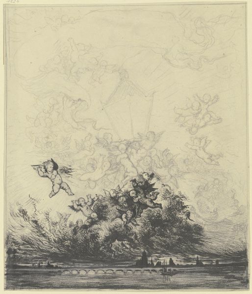Editor: This is Rodolphe Bresdin's "Peasant Interior," an engraving from 1850. It depicts the crucifixion. I find it intensely unsettling because of the starkness and the sheer amount of detail packed into such a small space. What symbols and narratives do you see at play here? Curator: The density is key. Bresdin has constructed a visual world that almost overwhelms, reminiscent of medieval tapestries filled with symbolic information. Consider the Christ figure, obviously central, yet look above: what figure do you see above Christ? And notice how the weeping figures at the base feel connected by cloth like wombs of rebirth. This isn’t just about suffering; it’s about transformation. Do you perceive that as well? Editor: I do see the rebirth element with the connected cloth. I hadn’t noticed the figure above the cross at first, I wonder what their role is meant to represent. Curator: Consider figures and their associated objects as containers for ideas. That figure aloft holds both spear and standard – they signify dominion but are cast against what could be considered the most poignant expression of humanity’s divine promise through sacrificial empathy. Do these symbols of earthly dominion carry additional meaning juxtaposed above the crucified Christ? Editor: So, are you saying that figure perhaps indicates the worldly powers that condemned Christ, contrasting that power with the promise of spiritual salvation through Christ's sacrifice? Curator: Precisely. Bresdin masterfully layers visual cues that reverberate across centuries. His genius is to suggest that these narratives of power and redemption are perpetually in dialogue with each other. Editor: This makes me see the engraving in a totally different way. I was so focused on the detail I was missing the bigger conversation of symbolic representation. Curator: The beauty of art is, we bring our own experiences and perspectives to this conversation across time.