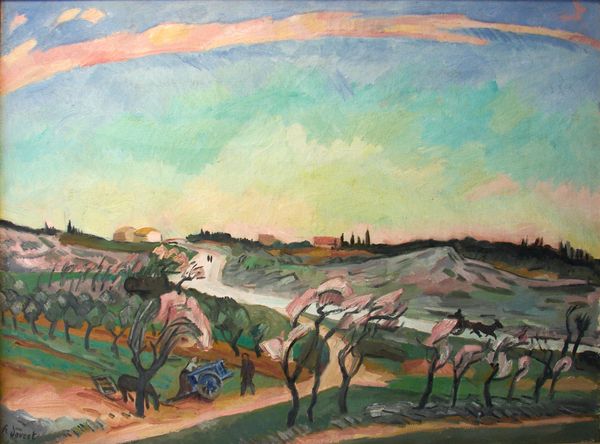 Curator: Before us is "Three Cypress Trees," a painting by Alexis Gritchenko, completed in 1956. It's an oil-on-canvas work that exemplifies post-impressionist landscape traditions. Editor: The somber tone immediately strikes me, the moody sky weighing heavily above the fields. There is a thickness of paint that adds a tactile quality to the work, even from this distance. Curator: Absolutely. Gritchenko was deeply engaged with capturing the essence of a place, both its physical appearance and its emotional resonance. As a Ukranian artist working across Europe, Gritchenko continuously dealt with identity. Consider this as not just a landscape, but also as a place where national and personal identity meets and questions assumptions of representation. Editor: It feels like the painting foregrounds process over illusion. Look at the materiality of the oil paint – how Gritchenko applies it almost sculpturally, it becomes almost about the field and less a mimicry of one. The repetitive patterns hint at the labor inherent in the agricultural landscape. Curator: And notice those three dark cypress trees in the foreground, anchoring the scene, drawing our eye up toward the stormy sky. They stand as sentinels or perhaps as witnesses, offering a symbolic counterpoint to the cultivated land. Cypress trees have rich religious associations that further enrichen this idea. Editor: Right, it invites us to ponder the contrast between human intervention and the more elemental forces of nature, both literally at ground level and metaphorically above, through its heavy clouds. I am also drawn to what I feel is the social relations that are made clear in fields that represent working grounds where human intervention makes a powerful commentary in the piece. Curator: The dynamic brushwork and the somewhat muted palette contribute to the painting’s sense of restless energy. Gritchenko paints this work with what you've said: The relations, labor and national connections and his emotional attachment and experience to those ideas. The tension gives us a compelling statement about Gritchenko's position as a diasporic artist working in Post-War Europe. Editor: Ultimately, this is how our understanding of "Three Cypress Trees" as an oil painting gives way to other types of considerations on history, and also class, given Gritchenko's own economic background. Curator: Yes, and how important to highlight and historicize our interpretations when experiencing works of art. Editor: This work stays with me, beyond just its aesthetic beauty.