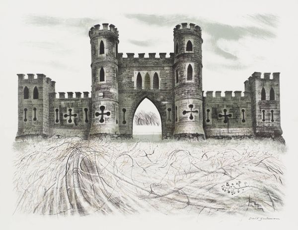 Editor: Here we have John Piper's "Bethesda Chapel." The stark architectural lines combined with those pastel blocks give it such a unique feel. What strikes you most about the composition? Curator: The interplay between representation and abstraction is compelling. Notice how the geometric forms disrupt the architectural rendering, creating a tension between surface and depth. Do you see how the texture reinforces this contrast? Editor: Yes, the roughness of the chapel against the flatness of the fence. What does it all signify? Curator: The artist isn't necessarily interested in a clear-cut meaning. Instead, he invites us to consider how form, color, and texture interact to create visual interest. Editor: It's certainly got that. I see it now.